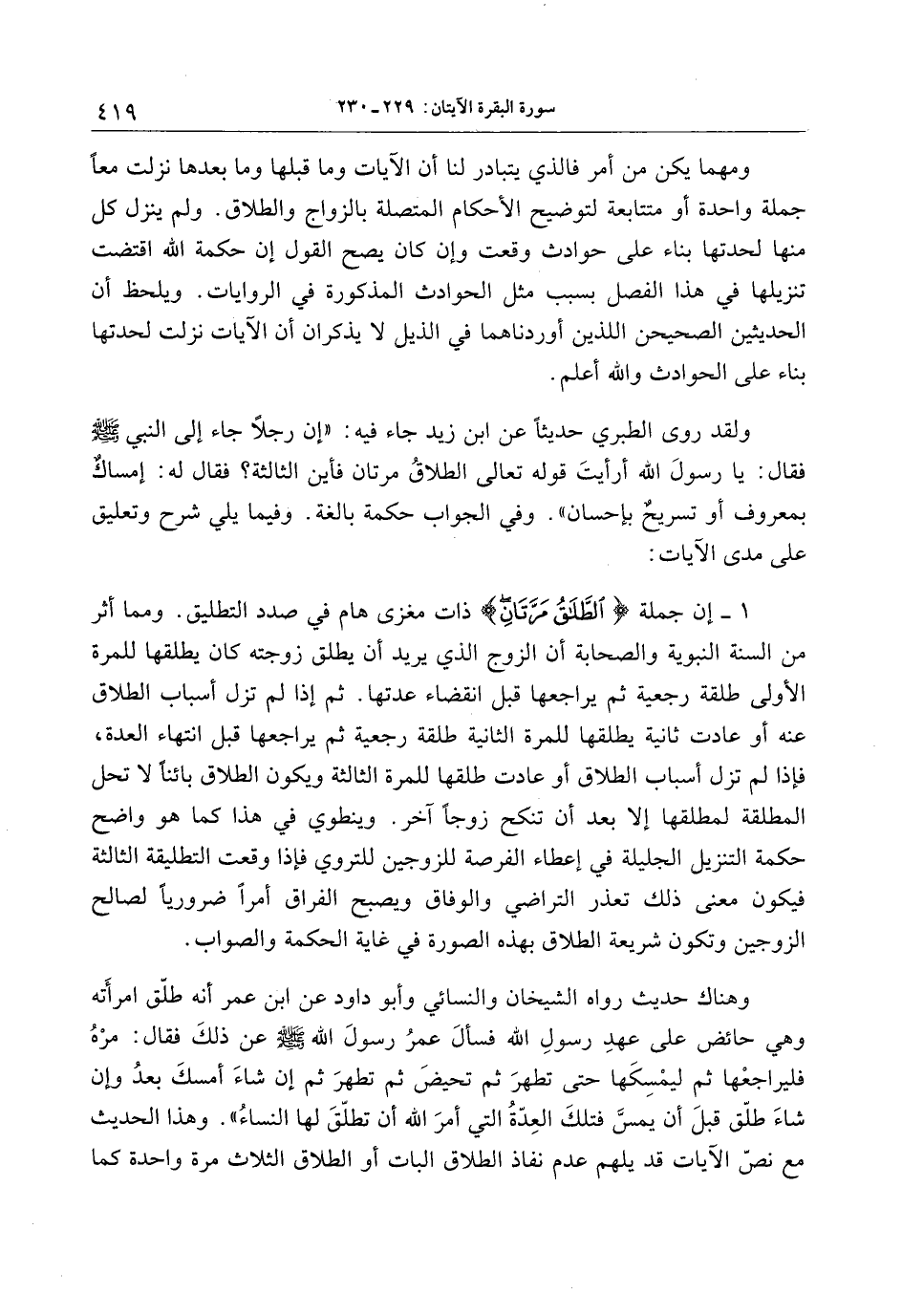 وهناك حديث رواه الشيخان والنسائي وأبو داود عن ابن عمر أنه طلّق امرأته وهي حائض على عهد رسول الله فسأل عمر رسول الله صلّى الله عليه وسلّم عن ذلك فقال: مره فليراجعها ثم ليمسكها حتى تطهر ثم تحيض ثم تطهر ثم إن شاء أمسك بعد وإن شاء طلّق قبل أن يمسّ فتلك العدّة التي أمر الله أن تطلّق لها النساء» . وهذا الحديث مع نصّ الآيات قد يلهم عدم نفاذ الطلاق البات أو الطلاق الثلاث مرة واحدة كما