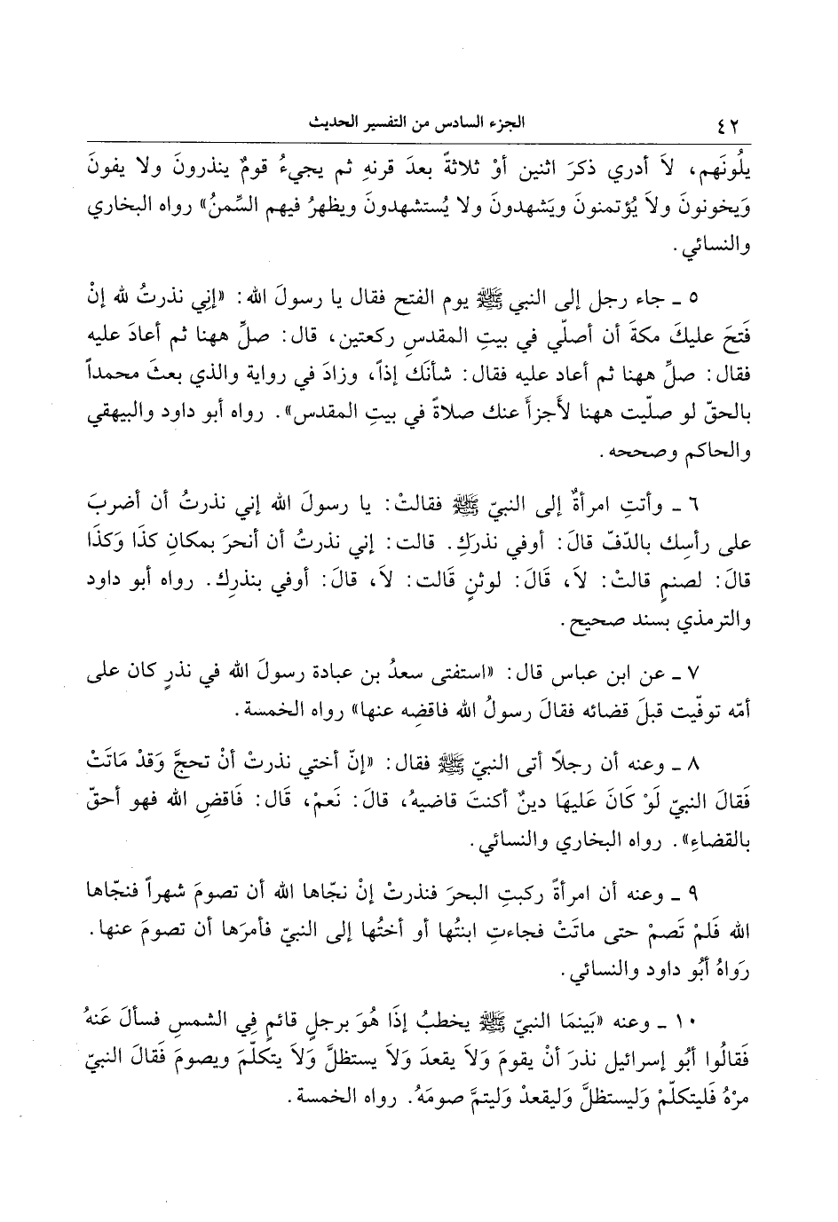 7- عن ابن عباس قال: «استفتى سعد بن عبادة رسول الله في نذر كان على أمّه توفّيت قبل قضائه فقال رسول الله فاقضه عنها» رواه الخمسة.