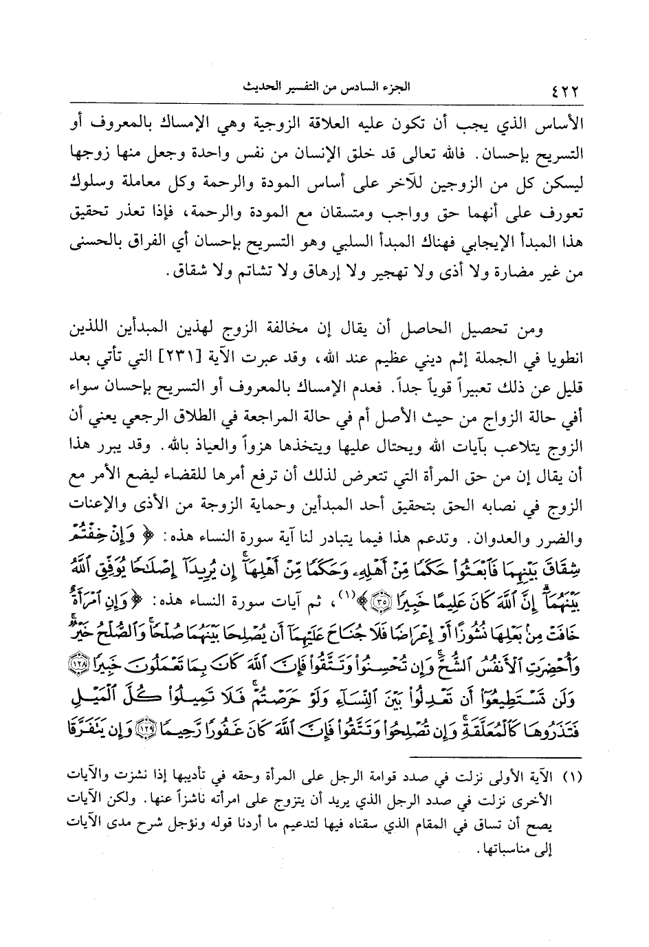 ومن تحصيل الحاصل أن يقال إن مخالفة الزوج لهذين المبدأين اللذين انطويا في الجملة إثم ديني عظيم عند الله، وقد عبرت الآية [231] التي تأتي بعد قليل عن ذلك تعبيرا قويا جدا. فعدم الإمساك بالمعروف أو التسريح بإحسان سواء أفي حالة الزواج من حيث الأصل أم في حالة المراجعة في الطلاق الرجعي يعني أن الزوج يتلاعب بآيات الله ويحتال عليها ويتخذها هزوا والعياذ بالله. وقد يبرر هذا أن يقال إن من حق المرأة التي تتعرض لذلك أن ترفع أمرها للقضاء ليضع الأمر مع الزوج في نصابه الحق بتحقيق أحد المبدأين وحماية الزوجة من الأذى والإعنات والضرر والعدوان. وتدعم هذا فيما يتبادر لنا آية سورة النساء هذه: وَإِنْ خِفْتُمْ شِقاقَ بَيْنِهِما فَابْعَثُوا حَكَماً مِنْ أَهْلِهِ وَحَكَماً مِنْ أَهْلِها إِنْ يُرِيدا إِصْلاحاً يُوَفِّقِ اللَّهُ بَيْنَهُما إِنَّ اللَّهَ كانَ عَلِيماً خَبِيراً (35) «1» ، ثم آيات سورة النساء هذه: وَإِنِ امْرَأَةٌ خافَتْ مِنْ بَعْلِها نُشُوزاً أَوْ إِعْراضاً فَلا جُناحَ عَلَيْهِما أَنْ يُصْلِحا بَيْنَهُما صُلْحاً وَالصُّلْحُ خَيْرٌ وَأُحْضِرَتِ الْأَنْفُسُ الشُّحَّ وَإِنْ تُحْسِنُوا وَتَتَّقُوا فَإِنَّ اللَّهَ كانَ بِما تَعْمَلُونَ خَبِيراً (128) وَلَنْ تَسْتَطِيعُوا أَنْ تَعْدِلُوا بَيْنَ النِّساءِ وَلَوْ حَرَصْتُمْ فَلا تَمِيلُوا كُلَّ الْمَيْلِ فَتَذَرُوها كَالْمُعَلَّقَةِ وَإِنْ تُصْلِحُوا وَتَتَّقُوا فَإِنَّ اللَّهَ كانَ غَفُوراً رَحِيماً (129) وَإِنْ يَتَفَرَّقا
