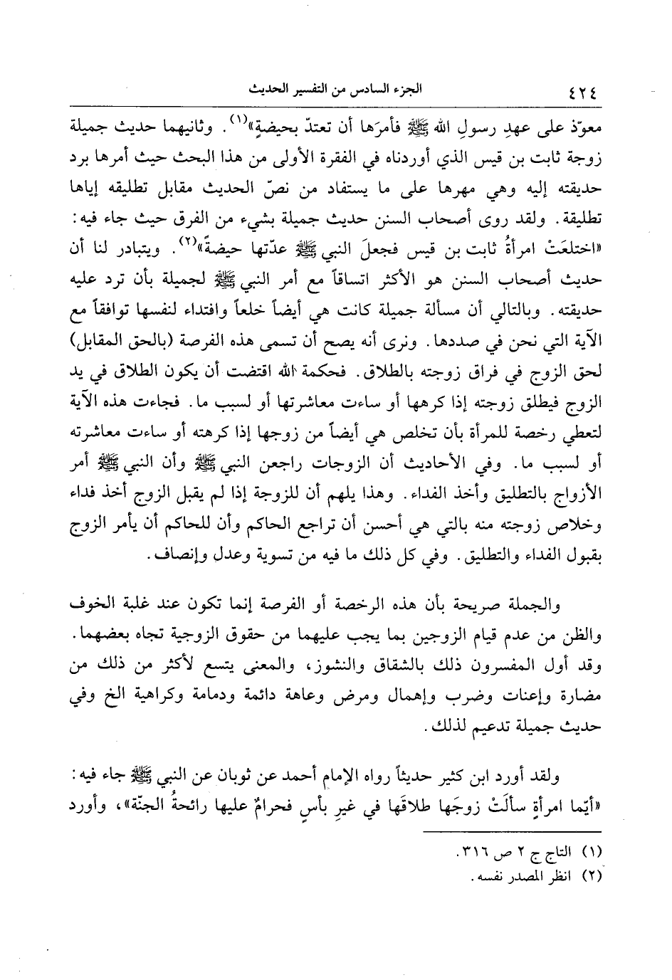 «اختلعت امرأة ثابت بن قيس فجعل النبي صلّى الله عليه وسلّم عدّتها حيضة» «2» . ويتبادر لنا أن حديث أصحاب السنن هو الأكثر اتساقا مع أمر النبي صلّى الله عليه وسلّم لجميلة بأن ترد عليه حديقته. وبالتالي أن مسألة جميلة كانت هي أيضا خلعا وافتداء لنفسها توافقا مع الآية التي نحن في صددها. ونرى أنه يصح أن تسمى هذه الفرصة (بالحق المقابل) لحق الزوج في فراق زوجته بالطلاق. فحكمة الله اقتضت أن يكون الطلاق في يد الزوج فيطلق زوجته إذا كرهها أو ساءت معاشرتها أو لسبب ما. فجاءت هذه الآية لتعطي رخصة للمرأة بأن تخلص هي أيضا من زوجها إذا كرهته أو ساءت معاشرته أو لسبب ما. وفي الأحاديث أن الزوجات راجعن النبي صلّى الله عليه وسلّم وأن النبي صلّى الله عليه وسلّم أمر الأزواج بالتطليق وأخذ الفداء. وهذا يلهم أن للزوجة إذا لم يقبل الزوج أخذ فداء وخلاص زوجته منه بالتي هي أحسن أن تراجع الحاكم وأن للحاكم أن يأمر الزوج بقبول الفداء والتطليق. وفي كل ذلك ما فيه من تسوية وعدل وإنصاف.