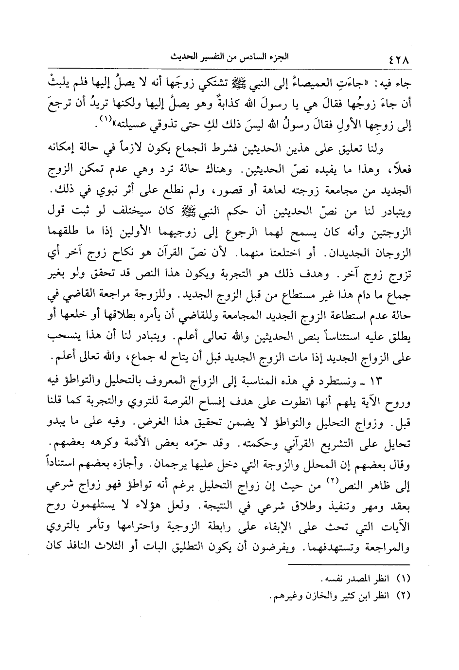 13- ونستطرد في هذه المناسبة إلى الزواج المعروف بالتحليل والتواطؤ فيه وروح الآية يلهم أنها انطوت على هدف إفساح الفرصة للتروي والتجربة كما قلنا قبل. وزواج التحليل والتواطؤ لا يضمن تحقيق هذا الغرض. وفيه على ما يبدو تحايل على التشريع القرآني وحكمته. وقد حرّمه بعض الأئمة وكرهه بعضهم.