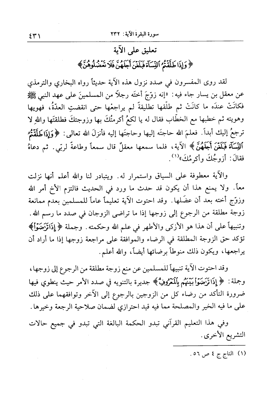 تعليق على الآية وَإِذا طَلَّقْتُمُ النِّساءَ فَبَلَغْنَ أَجَلَهُنَّ فَلا تَعْضُلُوهُنَ