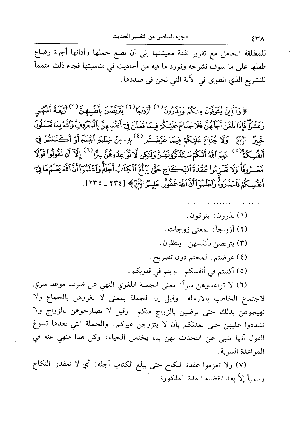 وَالَّذِينَ يُتَوَفَّوْنَ مِنْكُمْ وَيَذَرُونَ أَزْواجاً يَتَرَبَّصْنَ بِأَنْفُسِهِنَّ أَرْبَعَةَ أَشْهُرٍ وَعَشْراً فَإِذا بَلَغْنَ أَجَلَهُنَّ فَلا جُناحَ عَلَيْكُمْ فِيما فَعَلْنَ فِي أَنْفُسِهِنَّ بِالْمَعْرُوفِ وَاللَّهُ بِما تَعْمَلُونَ خَبِيرٌ (234) وَلا جُناحَ عَلَيْكُمْ فِيما عَرَّضْتُمْ بِهِ مِنْ خِطْبَةِ النِّساءِ أَوْ أَكْنَنْتُمْ فِي أَنْفُسِكُمْ عَلِمَ اللَّهُ أَنَّكُمْ سَتَذْكُرُونَهُنَّ وَلكِنْ لا تُواعِدُوهُنَّ سِرًّا إِلاَّ أَنْ تَقُولُوا قَوْلاً مَعْرُوفاً وَلا تَعْزِمُوا عُقْدَةَ النِّكاحِ حَتَّى يَبْلُغَ الْكِتابُ أَجَلَهُ وَاعْلَمُوا أَنَّ اللَّهَ يَعْلَمُ ما فِي أَنْفُسِكُمْ فَاحْذَرُوهُ وَاعْلَمُوا أَنَّ اللَّهَ غَفُورٌ حَلِيمٌ (235)