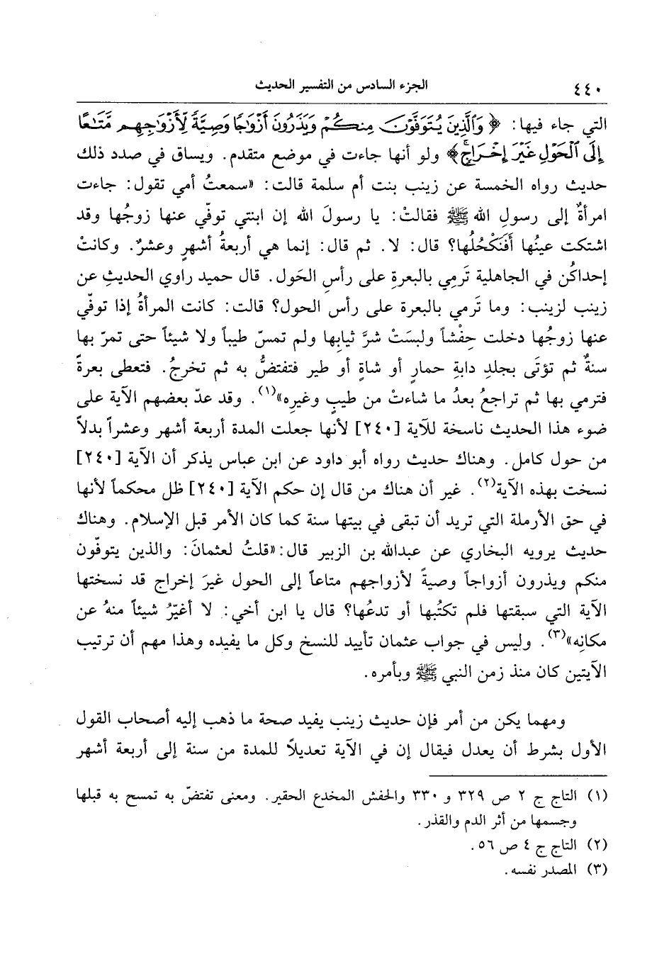 التي جاء فيها: وَالَّذِينَ يُتَوَفَّوْنَ مِنْكُمْ وَيَذَرُونَ أَزْواجاً وَصِيَّةً لِأَزْواجِهِمْ مَتاعاً إِلَى الْحَوْلِ غَيْرَ إِخْراجٍ ولو أنها جاءت في موضع متقدم. ويساق في صدد ذلك حديث رواه الخمسة عن زينب بنت أم سلمة قالت: «سمعت أمي تقول: جاءت امرأة إلى رسول الله صلّى الله عليه وسلّم فقالت: يا رسول الله إن ابنتي توفّي عنها زوجها وقد اشتكت عينها أفنكحلها؟ قال: لا. ثم قال: إنما هي أربعة أشهر وعشر. وكانت إحداكن في الجاهلية ترمي بالبعرة على رأس الحول. قال حميد راوي الحديث عن زينب لزينب: وما ترمي بالبعرة على رأس الحول؟ قالت: كانت المرأة إذا توفّي عنها زوجها دخلت حفشا ولبست شرّ ثيابها ولم تمسّ طيبا ولا شيئا حتى تمرّ بها سنة ثم تؤتى بجلد دابة حمار أو شاة أو طير فتفتضّ به ثم تخرج. فتعطى بعرة فترمي بها ثم تراجع بعد ما شاءت من طيب وغيره» «1» . وقد عدّ بعضهم الآية على ضوء هذا الحديث ناسخة للآية [240] لأنها جعلت المدة أربعة أشهر وعشرا بدلا من حول كامل. وهناك حديث رواه أبو داود عن ابن عباس يذكر أن الآية [240] نسخت بهذه الآية «2» . غير أن هناك من قال إن حكم الآية [240] ظل محكما لأنها في حق الأرملة التي تريد أن تبقى في بيتها سنة كما كان الأمر قبل الإسلام. وهناك حديث يرويه البخاري عن عبد الله بن الزبير قال: «قلت لعثمان: والذين يتوفّون منكم ويذرون أزواجا وصية لأزواجهم متاعا إلى الحول غير إخراج قد نسختها الآية التي سبقتها فلم تكتبها أو تدعها؟ قال يا ابن أخي: لا أغيّر شيئا منه عن مكانه» «3» . وليس في جواب عثمان تأييد للنسخ وكل ما يفيده وهذا مهم أن ترتيب الآيتين كان منذ زمن النبي صلّى الله عليه وسلّم وبأمره.
