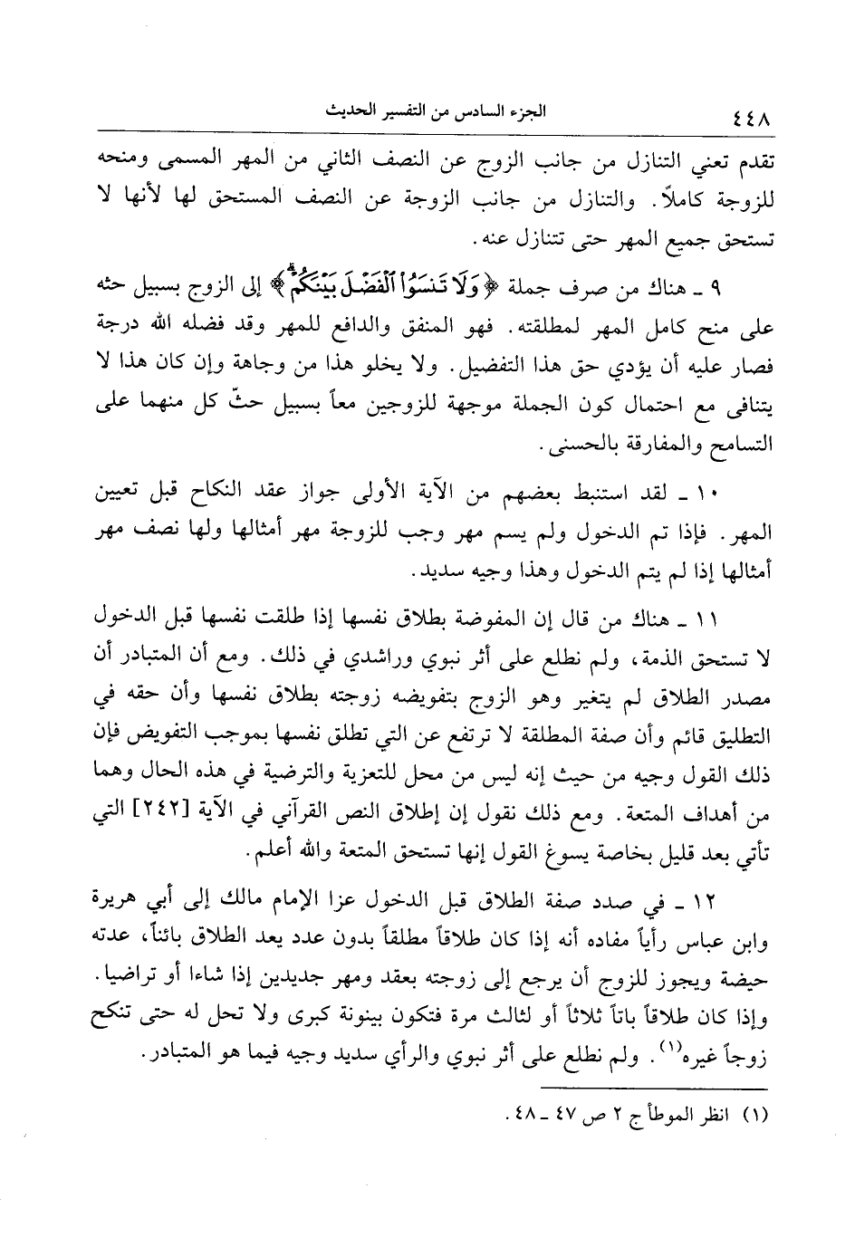 10- لقد استنبط بعضهم من الآية الأولى جواز عقد النكاح قبل تعيين المهر. فإذا تم الدخول ولم يسم مهر وجب للزوجة مهر أمثالها ولها نصف مهر أمثالها إذا لم يتم الدخول وهذا وجيه سديد.