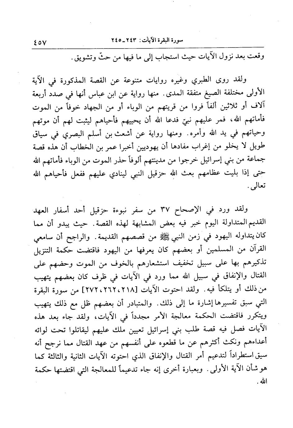 ولقد ورد في الإصحاح 37 من سفر نبوءة حزقيل أحد أسفار العهد القديم المتداولة اليوم خبر فيه بعض المشابهة لهذه القصة. حيث يبدو أن مما كان يتداوله اليهود في زمن النبي صلّى الله عليه وسلّم من قصصهم القديمة. والراجح أن سامعي القرآن من المسلمين أو بعضهم كان يعرفها من اليهود فاقتضت حكمة التنزيل تذكيرهم بها على سبيل تخفيف استشعارهم بالخوف من الموت وحضهم على القتال والإنفاق في سبيل الله مما ورد في الآيات في ظرف كان بعضهم يتهيب من ذلك أو يتلكأ فيه. ولقد احتوت الآيات [218، 262، 272] من سورة البقرة التي سبق تفسيرها إشارة ما إلى ذلك. والمتبادر أن بعضهم ظل مع ذلك يتهيب ويتكرر فاقتضت الحكمة معالجة الأمر مجددا في الآيات، ولقد جاء بعد هذه الآيات فصل فيه قصة طلب بني إسرائيل تعيين ملك عليهم ليقاتلوا تحت لوائه أعداءهم ونكث أكثرهم عن ما قطعوه على أنفسهم من عهد القتال مما نرجح أنه سيق استطرادا لتدعيم أمر القتال والإنفاق الذي احتوته الآيات الثانية والثالثة كما هو شأن الآية الأولى. وبعبارة أخرى إنه جاء تدعيما للمعالجة التي اقتضتها حكمة الله.