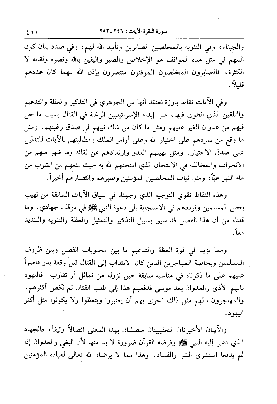 ومما يزيد في قوة العظة والتدعيم ما بين محتويات الفصل وبين ظروف المسلمين وبخاصة المهاجرين الذين كان الانتداب إلى القتال قبل وقعة بدر قاصرا عليهم على ما ذكرناه في مناسبة سابقة حين نزوله من تماثل أو تقارب. فاليهود نالهم الأذى والعدوان بعد موسى فدفعهم هذا إلى طلب القتال ثم نكص أكثرهم، والمهاجرون نالهم مثل ذلك فحري بهم أن يعتبروا ويتعظوا ولا يكونوا مثل أكثر اليهود.
