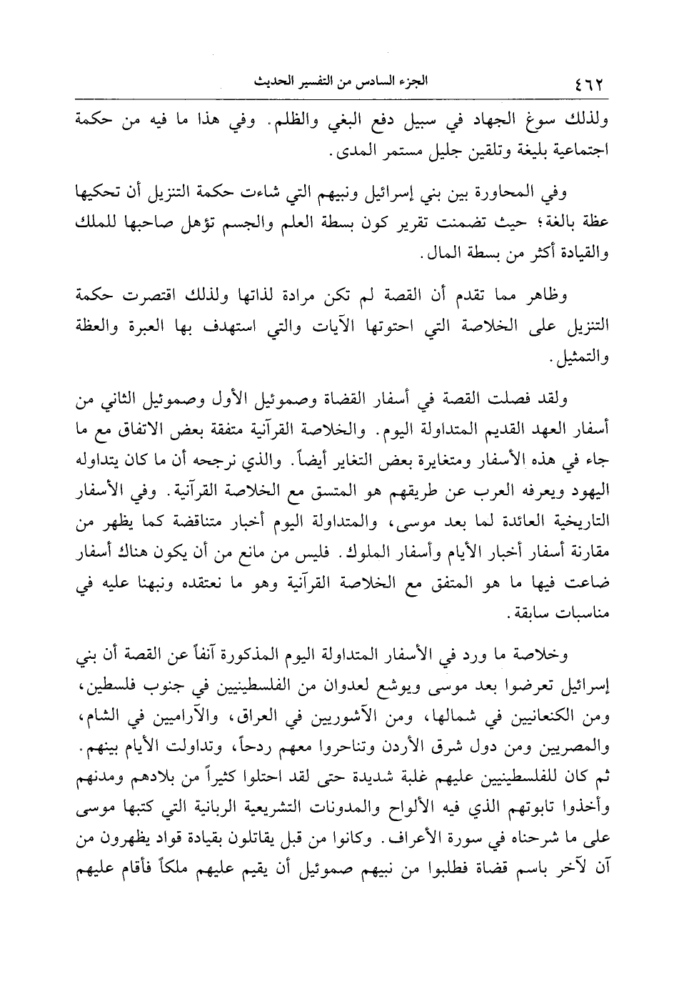 ولقد فصلت القصة في أسفار القضاة وصموئيل الأول وصموئيل الثاني من أسفار العهد القديم المتداولة اليوم. والخلاصة القرآنية متفقة بعض الاتفاق مع ما جاء في هذه الأسفار ومتغايرة بعض التغاير أيضا. والذي نرجحه أن ما كان يتداوله اليهود ويعرفه العرب عن طريقهم هو المتسق مع الخلاصة القرآنية. وفي الأسفار التاريخية العائدة لما بعد موسى، والمتداولة اليوم أخبار متناقضة كما يظهر من مقارنة أسفار أخبار الأيام وأسفار الملوك. فليس من مانع من أن يكون هناك أسفار ضاعت فيها ما هو المتفق مع الخلاصة القرآنية وهو ما نعتقده ونبهنا عليه في مناسبات سابقة.