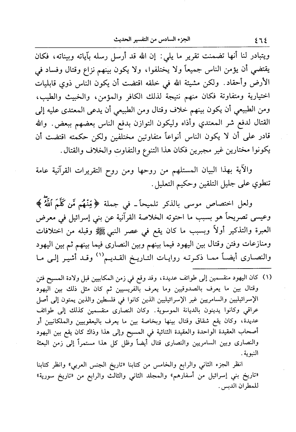 ولعل اختصاص موسى بالذكر تلميحا- في جملة مِنْهُمْ مَنْ كَلَّمَ اللَّهُ وعيسى تصريحا هو بسبب ما احتوته الخلاصة القرآنية عن بني إسرائيل في معرض العبرة والتذكير أولا وبسبب ما كان يقع في عصر النبي صلّى الله عليه وسلّم وقبله من اختلافات ومنازعات وفتن وقتال بين اليهود فيما بينهم وبين النصارى فيما بينهم ثم بين اليهود والنصارى أيضا مما ذكرته روايات التاريخ القديم «1» وقد أشير إلى ما