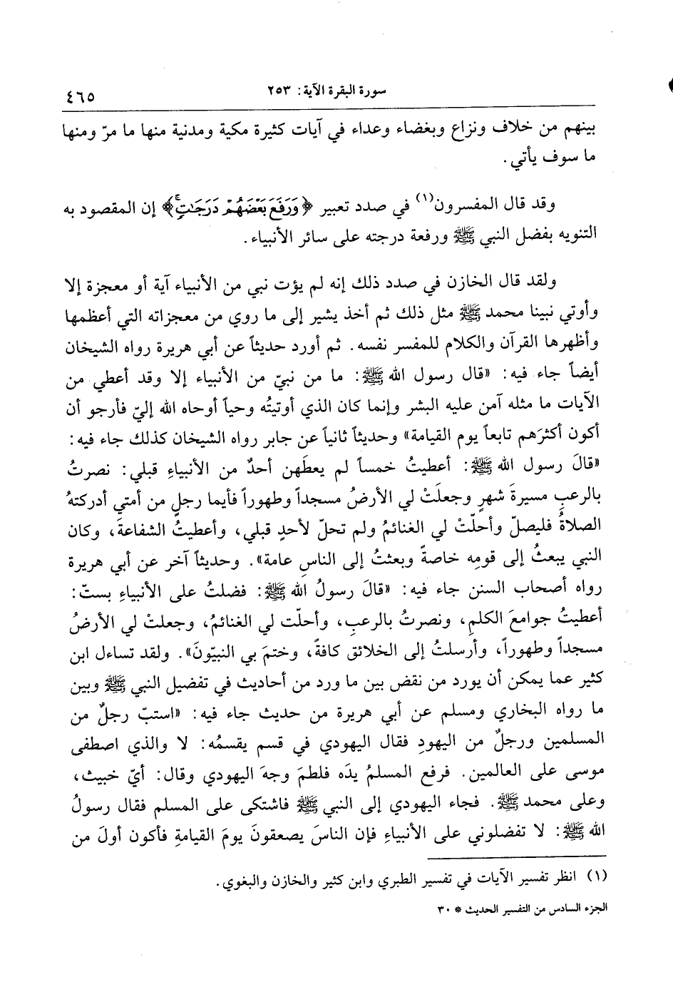 وقد قال المفسرون «1» في صدد تعبير وَرَفَعَ بَعْضَهُمْ دَرَجاتٍ إن المقصود به التنويه بفضل النبي صلّى الله عليه وسلّم ورفعة درجته على سائر الأنبياء.