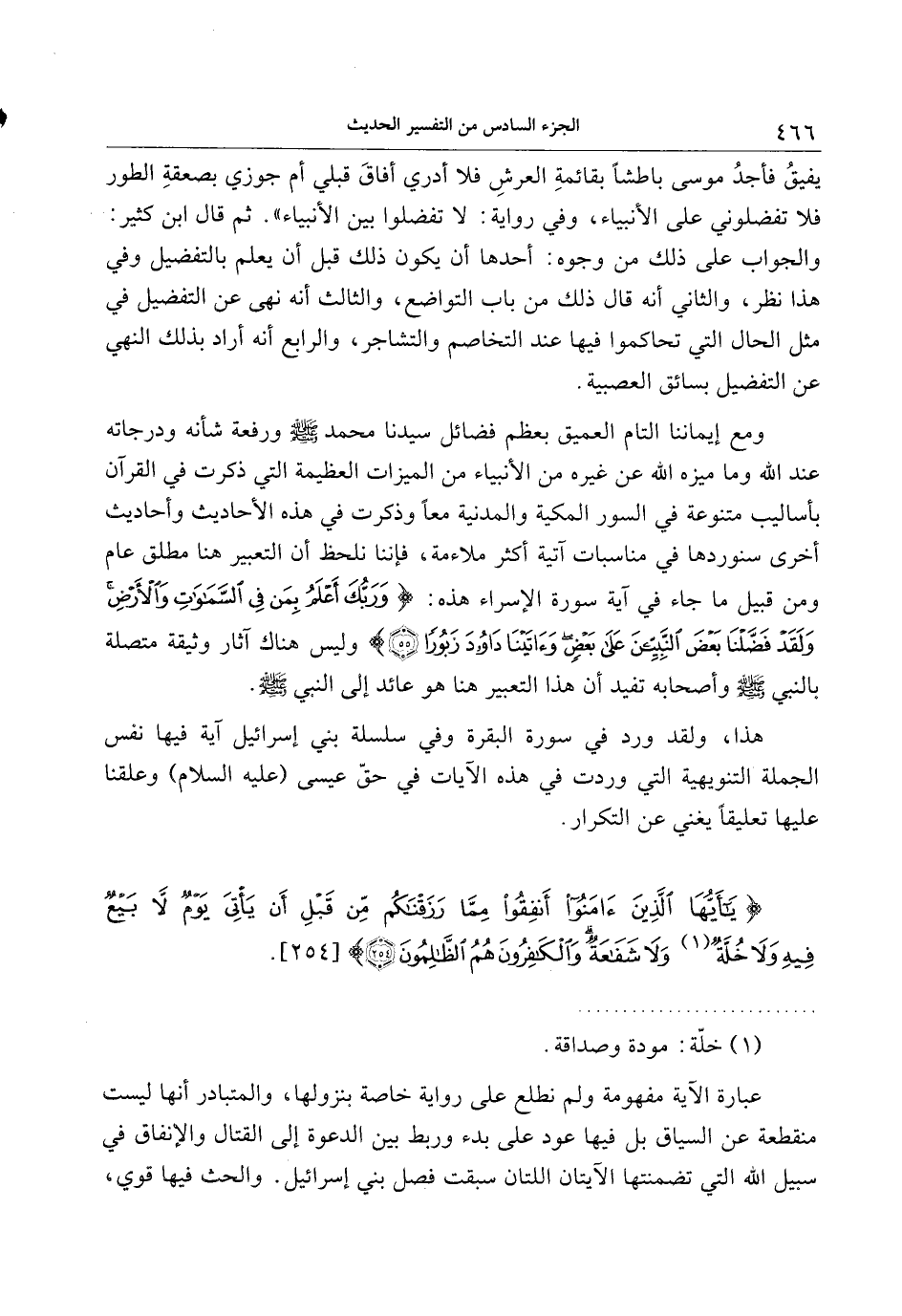 ومع إيماننا التام العميق بعظم فضائل سيدنا محمد صلّى الله عليه وسلّم ورفعة شأنه ودرجاته عند الله وما ميزه الله عن غيره من الأنبياء من الميزات العظيمة التي ذكرت في القرآن بأساليب متنوعة في السور المكية والمدنية معا وذكرت في هذه الأحاديث وأحاديث أخرى سنوردها في مناسبات آتية أكثر ملاءمة، فإننا نلحظ أن التعبير هنا مطلق عام ومن قبيل ما جاء في آية سورة الإسراء هذه: وَرَبُّكَ أَعْلَمُ بِمَنْ فِي السَّماواتِ وَالْأَرْضِ وَلَقَدْ فَضَّلْنا بَعْضَ النَّبِيِّينَ عَلى بَعْضٍ وَآتَيْنا داوُدَ زَبُوراً (55) وليس هناك آثار وثيقة متصلة بالنبي صلّى الله عليه وسلّم وأصحابه تفيد أن هذا التعبير هنا هو عائد إلى النبي صلّى الله عليه وسلّم.
