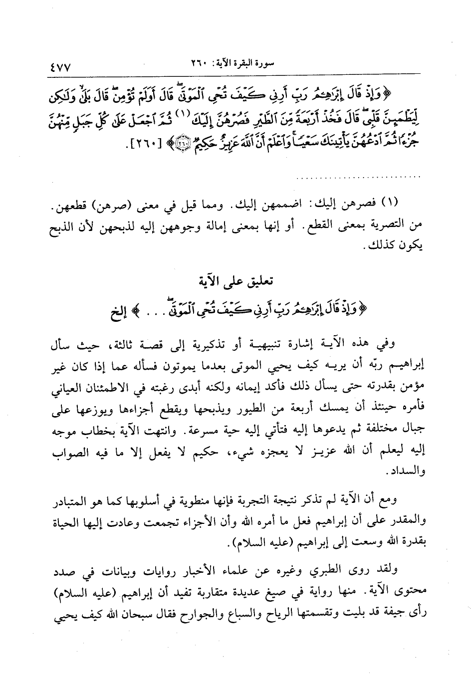 وَإِذْ قالَ إِبْراهِيمُ رَبِّ أَرِنِي كَيْفَ تُحْيِ الْمَوْتى قالَ أَوَلَمْ تُؤْمِنْ قالَ بَلى وَلكِنْ لِيَطْمَئِنَّ قَلْبِي قالَ فَخُذْ أَرْبَعَةً مِنَ الطَّيْرِ فَصُرْهُنَّ إِلَيْكَ ثُمَّ اجْعَلْ عَلى كُلِّ جَبَلٍ مِنْهُنَّ جُزْءاً ثُمَّ ادْعُهُنَّ يَأْتِينَكَ سَعْياً وَاعْلَمْ أَنَّ اللَّهَ عَزِيزٌ حَكِيمٌ (260)