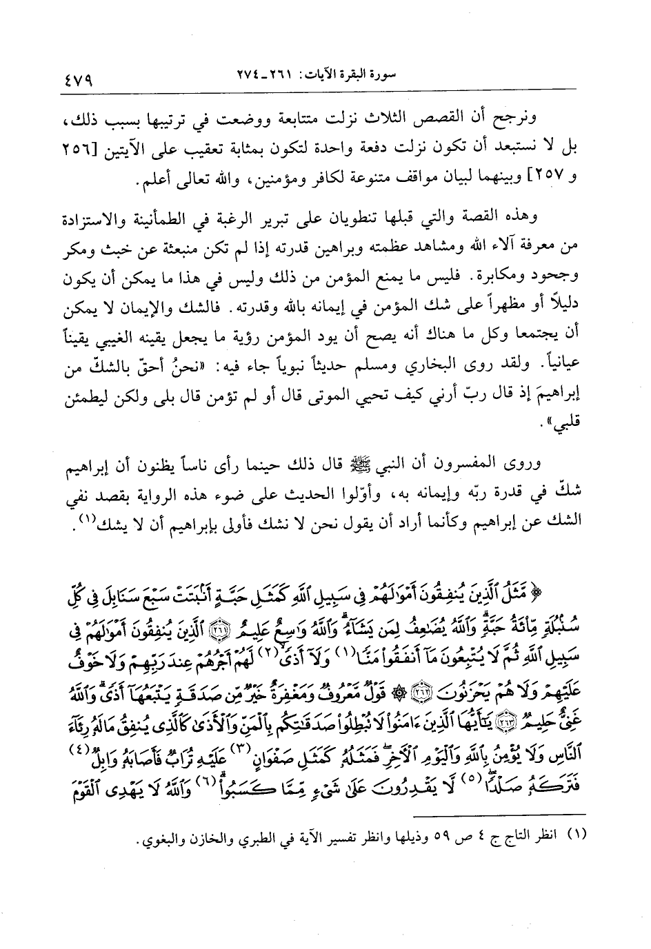 إِنْ تُبْدُوا الصَّدَقاتِ فَنِعِمَّا هِيَ وَإِنْ تُخْفُوها وَتُؤْتُوهَا الْفُقَراءَ فَهُوَ خَيْرٌ لَكُمْ وَيُكَفِّرُ عَنْكُمْ مِنْ سَيِّئاتِكُمْ وَاللَّهُ بِما تَعْمَلُونَ خَبِيرٌ (271) لَيْسَ عَلَيْكَ هُداهُمْ وَلكِنَّ اللَّهَ يَهْدِي مَنْ يَشاءُ وَما تُنْفِقُوا مِنْ خَيْرٍ فَلِأَنْفُسِكُمْ وَما تُنْفِقُونَ إِلاَّ ابْتِغاءَ وَجْهِ اللَّهِ وَما تُنْفِقُوا مِنْ خَيْرٍ يُوَفَّ إِلَيْكُمْ وَأَنْتُمْ لا تُظْلَمُونَ (272) لِلْفُقَراءِ الَّذِينَ أُحْصِرُوا فِي سَبِيلِ اللَّهِ لا يَسْتَطِيعُونَ ضَرْباً فِي الْأَرْضِ يَحْسَبُهُمُ الْجاهِلُ أَغْنِياءَ مِنَ التَّعَفُّفِ تَعْرِفُهُمْ بِسِيماهُمْ لا يَسْئَلُونَ النَّاسَ إِلْحافاً وَما تُنْفِقُوا مِنْ خَيْرٍ فَإِنَّ اللَّهَ بِهِ عَلِيمٌ (273) الَّذِينَ يُنْفِقُونَ أَمْوالَهُمْ بِاللَّيْلِ وَالنَّهارِ سِرًّا وَعَلانِيَةً فَلَهُمْ أَجْرُهُمْ عِنْدَ رَبِّهِمْ وَلا خَوْفٌ عَلَيْهِمْ وَلا هُمْ يَحْزَنُونَ (274) .