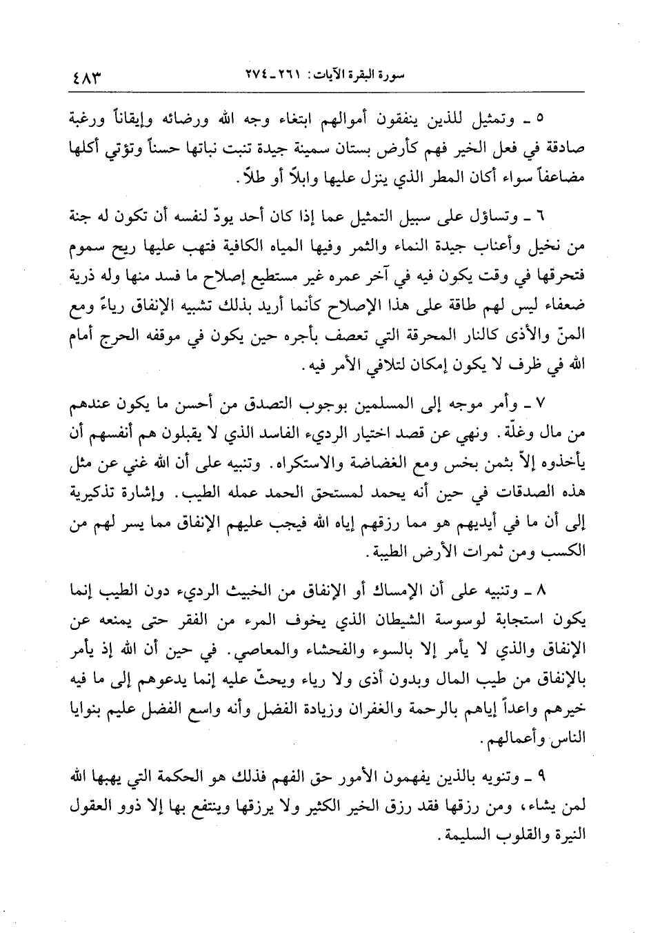 7- وأمر موجه إلى المسلمين بوجوب التصدق من أحسن ما يكون عندهم من مال وغلّة. ونهي عن قصد اختيار الرديء الفاسد الذي لا يقبلون هم أنفسهم أن يأخذوه إلّا بثمن بخس ومع الغضاضة والاستكراه. وتنبيه على أن الله غني عن مثل هذه الصدقات في حين أنه يحمد لمستحق الحمد عمله الطيب. وإشارة تذكيرية إلى أن ما في أيديهم هو مما رزقهم إياه الله فيجب عليهم الإنفاق مما يسر لهم من الكسب ومن ثمرات الأرض الطيبة.