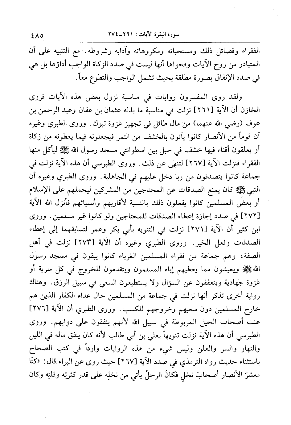 ولقد روى المفسرون روايات في مناسبة نزول بعض هذه الآيات فروى الخازن أن الآية [261] نزلت في مناسبة ما بذله عثمان بن عفان وعبد الرحمن بن عوف (رضي الله عنهما) من مال طائل في تجهيز غزوة تبوك. وروى الطبري وغيره أن قوما من الأنصار كانوا يأتون بالخشف من التمر فيجعلونه فيما يعطونه من زكاة أو يعلقون أقناء فيها خشف في حبل بين اسطوانتي مسجد رسول الله صلّى الله عليه وسلّم ليأكل منها الفقراء فنزلت الآية [267] لتنهى عن ذلك. وروى الطبرسي أن هذه الآية نزلت في جماعة كانوا يتصدقون من ربا دخل عليهم في الجاهلية. وروى الطبري وغيره أن النبي صلّى الله عليه وسلّم كان يمنع الصدقات عن المحتاجين من المشركين ليحملهم على الإسلام أو بعض المسلمين كانوا يفعلون ذلك بالنسبة لأقاربهم وأنسبائهم فأنزل الله الآية [272] في صدد إجازة إعطاء الصدقات للمحتاجين ولو كانوا غير مسلمين. وروى ابن كثير أن الآية [271] نزلت في التنويه بأبي بكر وعمر لتسابقهما إلى إعطاء الصدقات وفعل الخير. وروى الطبري وغيره أن الآية [273] نزلت في أهل الصفة، وهم جماعة من فقراء المسلمين الغرباء كانوا يبقون في مسجد رسول الله صلّى الله عليه وسلّم ويعيشون مما يعطيهم إياه المسلمون ويتقدمون للخروج في كل سرية أو غزوة جهادية ويتعففون عن السؤال ولا يستطيعون السعي في سبيل الرزق. وهناك رواية أخرى تذكر أنها نزلت في جماعة من المسلمين حال عداء الكفار الذين هم خارج المسلمين دون سعيهم وخروجهم للكسب. وروى الطبري أن الآية [276] عنت أصحاب الخيل المربوطة في سبيل الله لأنهم ينفقون على دوابهم. وروى الطبرسي أن هذه الآية نزلت تنويها بعلي بن أبي طالب لأنه كان ينفق ماله في الليل والنهار والسر والعلن وليس شيء من هذه الروايات واردا في كتب الصحاح باستثناء حديث رواه الترمذي في صدد الآية [267] حيث روى عن البراء قال: «كنّا معشر الأنصار أصحاب نخل فكان الرجل يأتي من نخله على قدر كثرته وقلته وكان