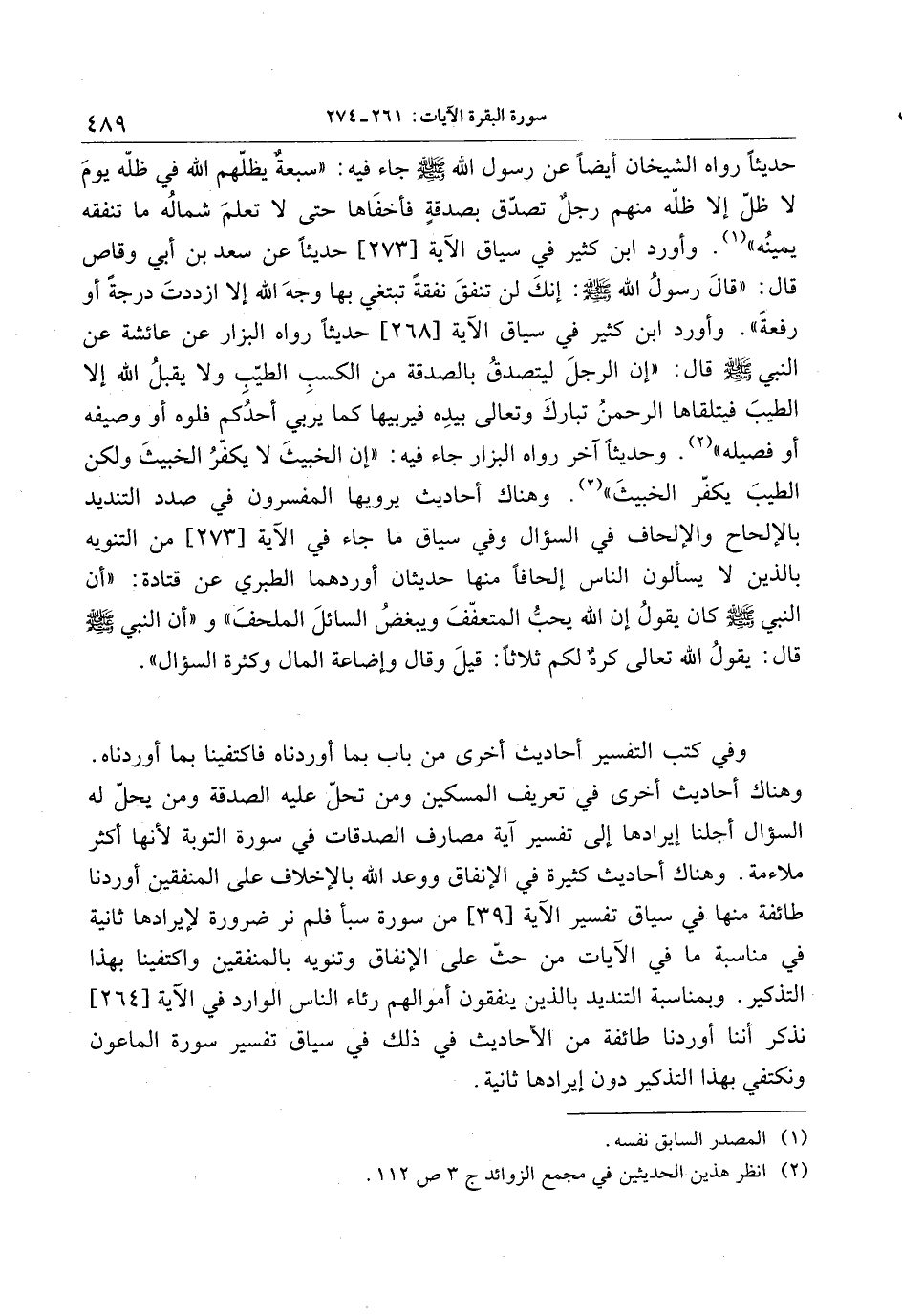 وهناك أحاديث أخرى في تعريف المسكين ومن تحلّ عليه الصدقة ومن يحلّ له السؤال أجلنا إيرادها إلى تفسير آية مصارف الصدقات في سورة التوبة لأنها أكثر ملاءمة. وهناك أحاديث كثيرة في الإنفاق ووعد الله بالإخلاف على المنفقين أوردنا طائفة منها في سياق تفسير الآية [39] من سورة سبأ فلم نر ضرورة لإيرادها ثانية في مناسبة ما في الآيات من حثّ على الإنفاق وتنويه بالمنفقين واكتفينا بهذا التذكير. وبمناسبة التنديد بالذين ينفقون أموالهم رئاء الناس الوارد في الآية [264] نذكر أننا أوردنا طائفة من الأحاديث في ذلك في سياق تفسير سورة الماعون ونكتفي بهذا التذكير دون إيرادها ثانية.