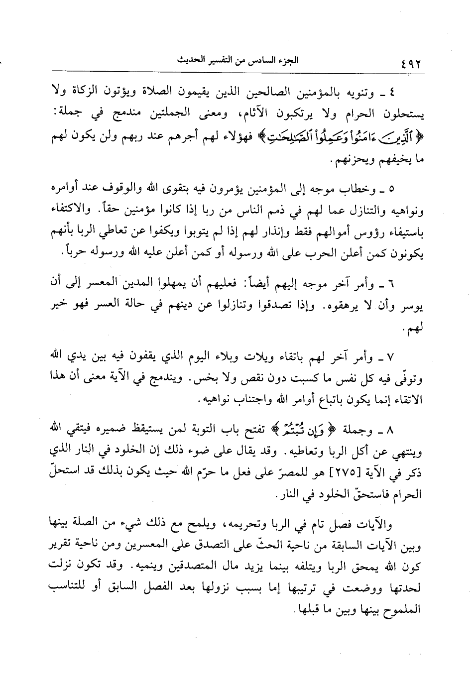 5- وخطاب موجه إلى المؤمنين يؤمرون فيه بتقوى الله والوقوف عند أوامره ونواهيه والتنازل عما لهم في ذمم الناس من ربا إذا كانوا مؤمنين حقا. والاكتفاء باستيفاء رؤوس أموالهم فقط وإنذار لهم إذا لم يتوبوا ويكفوا عن تعاطي الربا بأنهم يكونون كمن أعلن الحرب على الله ورسوله أو كمن أعلن عليه الله ورسوله حربا.