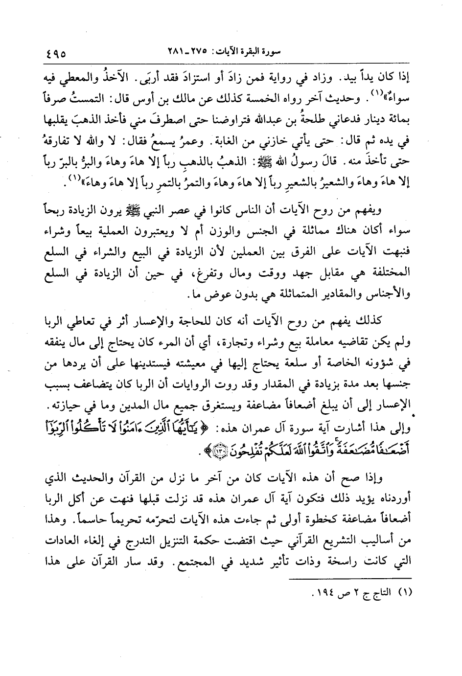 ويفهم من روح الآيات أن الناس كانوا في عصر النبي صلّى الله عليه وسلّم يرون الزيادة ربحا سواء أكان هناك مماثلة في الجنس والوزن أم لا ويعتبرون العملية بيعا وشراء فنبهت الآيات على الفرق بين العملين لأن الزيادة في البيع والشراء في السلع المختلفة هي مقابل جهد ووقت ومال وتفرغ، في حين أن الزيادة في السلع والأجناس والمقادير المتماثلة هي بدون عوض ما.