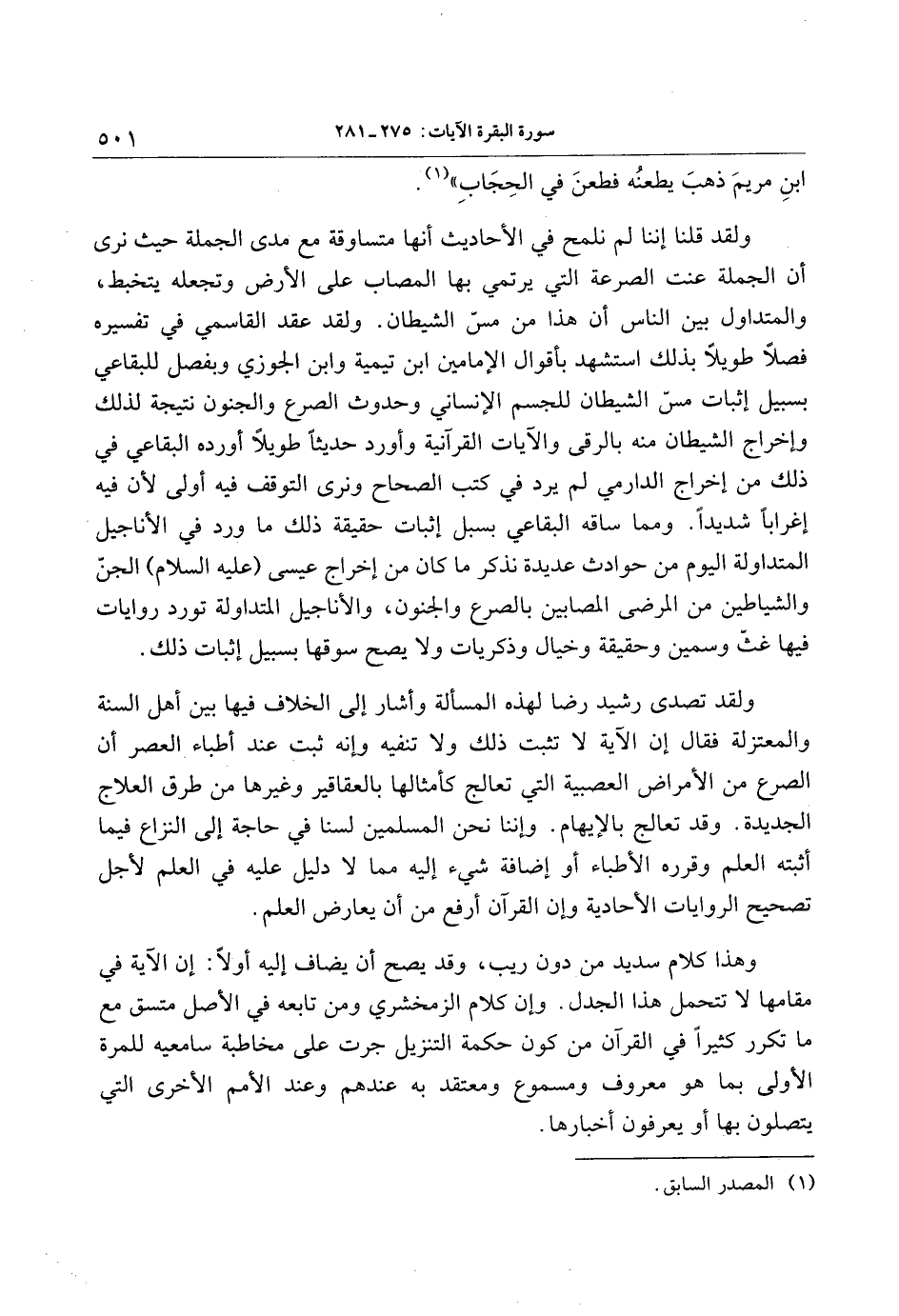 ولقد تصدى رشيد رضا لهذه المسألة وأشار إلى الخلاف فيها بين أهل السنة والمعتزلة فقال إن الآية لا تثبت ذلك ولا تنفيه وإنه ثبت عند أطباء العصر أن الصرع من الأمراض العصبية التي تعالج كأمثالها بالعقاقير وغيرها من طرق العلاج الجديدة. وقد تعالج بالإيهام. وإننا نحن المسلمين لسنا في حاجة إلى النزاع فيما أثبته العلم وقرره الأطباء أو إضافة شيء إليه مما لا دليل عليه في العلم لأجل تصحيح الروايات الآحادية وإن القرآن أرفع من أن يعارض العلم.