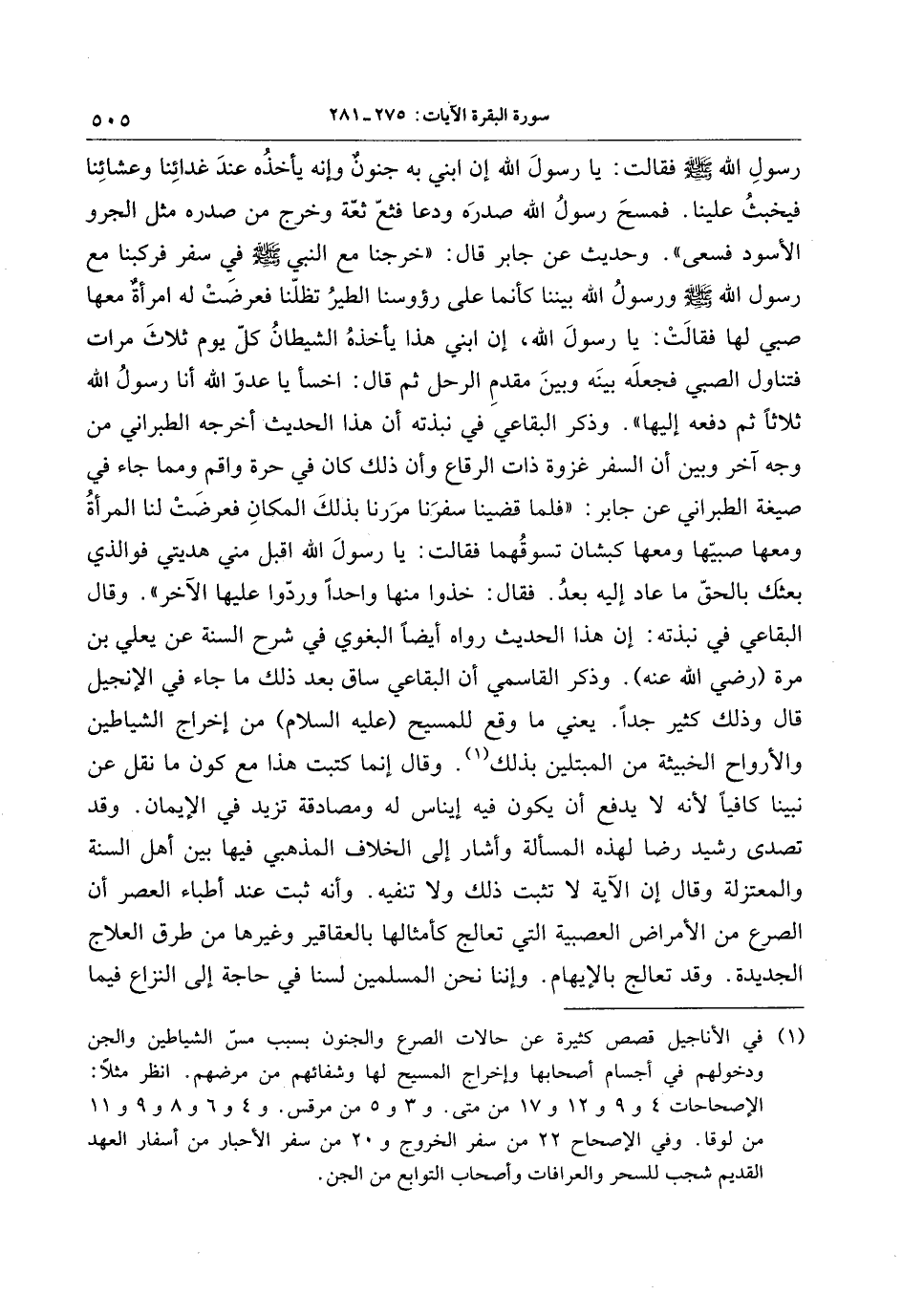 رسول الله صلّى الله عليه وسلّم فقالت: يا رسول الله إن ابني به جنون وإنه يأخذه عند غدائنا وعشائنا فيخبث علينا. فمسح رسول الله صدره ودعا فثعّ ثعّة وخرج من صدره مثل الجرو الأسود فسعى» . وحديث عن جابر قال: «خرجنا مع النبي صلّى الله عليه وسلّم في سفر فركبنا مع رسول الله صلّى الله عليه وسلّم ورسول الله بيننا كأنما على رؤوسنا الطير تظلّنا فعرضت له امرأة معها صبي لها فقالت: يا رسول الله، إن ابني هذا يأخذه الشيطان كلّ يوم ثلاث مرات فتناول الصبي فجعله بينه وبين مقدم الرحل ثم قال: اخسأ يا عدوّ الله أنا رسول الله ثلاثا ثم دفعه إليها» . وذكر البقاعي في نبذته أن هذا الحديث أخرجه الطبراني من وجه آخر وبين أن السفر غزوة ذات الرقاع وأن ذلك كان في حرة واقم ومما جاء في صيغة الطبراني عن جابر: «فلما قضينا سفرنا مررنا بذلك المكان فعرضت لنا المرأة ومعها صبيّها ومعها كبشان تسوقهما فقالت: يا رسول الله اقبل مني هديتي فو الذي بعثك بالحقّ ما عاد إليه بعد. فقال: خذوا منها واحدا وردّوا عليها الآخر» . وقال البقاعي في نبذته: إن هذا الحديث رواه أيضا البغوي في شرح السنة عن يعلي بن مرة (رضي الله عنه) . وذكر القاسمي أن البقاعي ساق بعد ذلك ما جاء في الإنجيل قال وذلك كثير جدا. يعني ما وقع للمسيح (عليه السلام) من إخراج الشياطين والأرواح الخبيثة من المبتلين بذلك «1» . وقال إنما كتبت هذا مع كون ما نقل عن نبينا كافيا لأنه لا يدفع أن يكون فيه إيناس له ومصادقة تزيد في الإيمان. وقد تصدى رشيد رضا لهذه المسألة وأشار إلى الخلاف المذهبي فيها بين أهل السنة والمعتزلة وقال إن الآية لا تثبت ذلك ولا تنفيه. وأنه ثبت عند أطباء العصر أن الصرع من الأمراض العصبية التي تعالج كأمثالها بالعقاقير وغيرها من طرق العلاج الجديدة. وقد تعالج بالإيهام. وإننا نحن المسلمين لسنا في حاجة إلى النزاع فيما