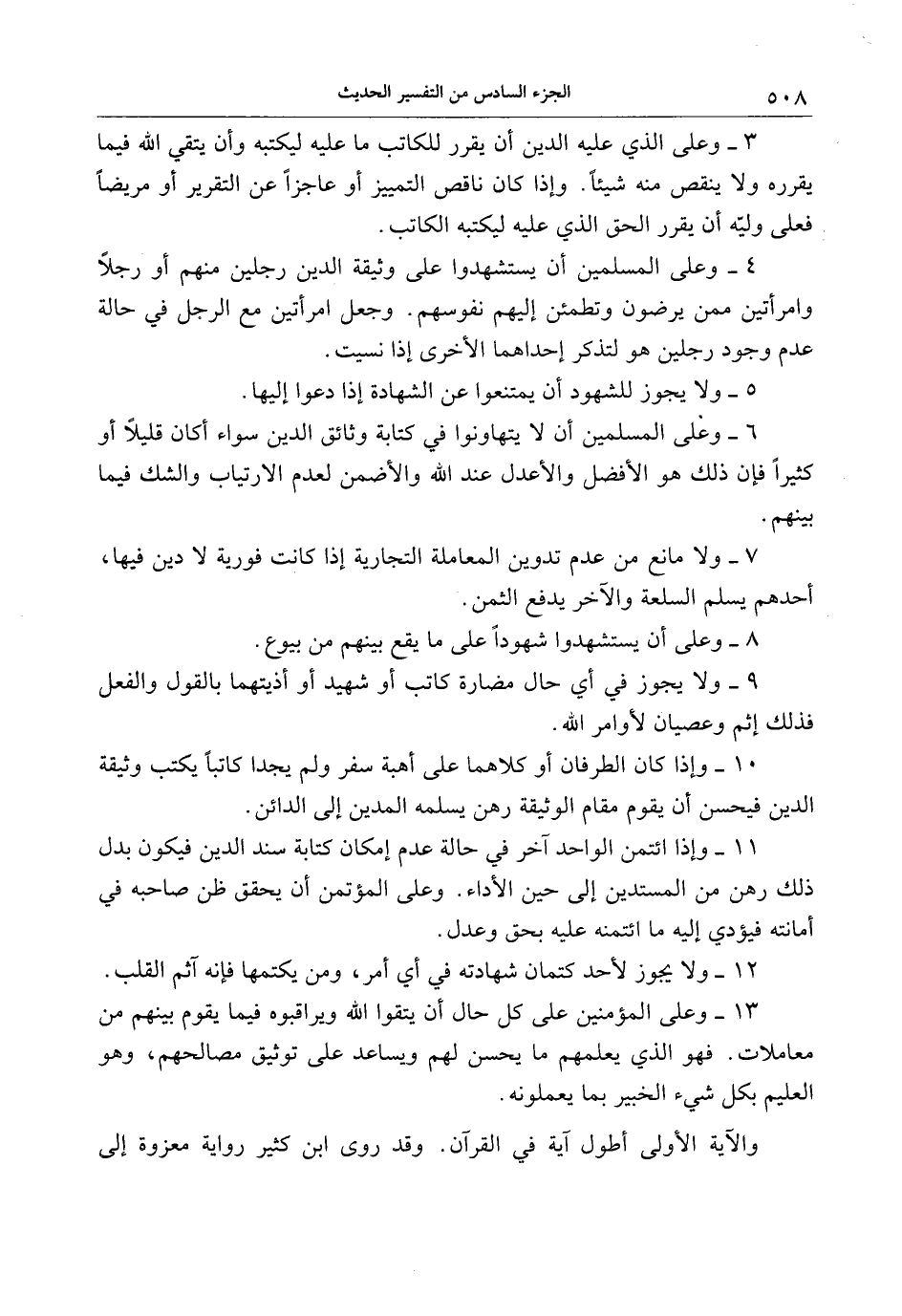 6- وعلى المسلمين أن لا يتهاونوا في كتابة وثائق الدين سواء أكان قليلا أو كثيرا فإن ذلك هو الأفضل والأعدل عند الله والأضمن لعدم الارتياب والشك فيما بينهم.
