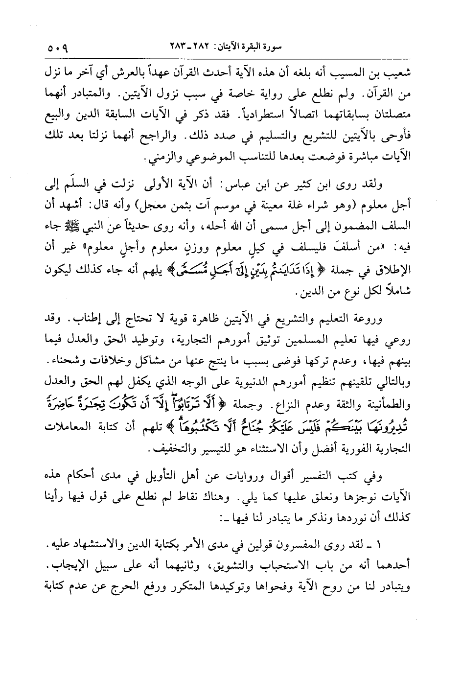 ولقد روى ابن كثير عن ابن عباس: أن الآية الأولى نزلت في السلم إلى أجل معلوم (وهو شراء غلة معينة في موسم آت بثمن معجل) وأنه قال: أشهد أن السلف المضمون إلى أجل مسمى أن الله أحله، وأنه روى حديثا عن النبي صلّى الله عليه وسلّم جاء فيه: «من أسلف فليسلف في كيل معلوم ووزن معلوم وأجل معلوم» غير أن الإطلاق في جملة إِذا تَدايَنْتُمْ بِدَيْنٍ إِلى أَجَلٍ مُسَمًّى يلهم أنه جاء كذلك ليكون شاملا لكل نوع من الدين.