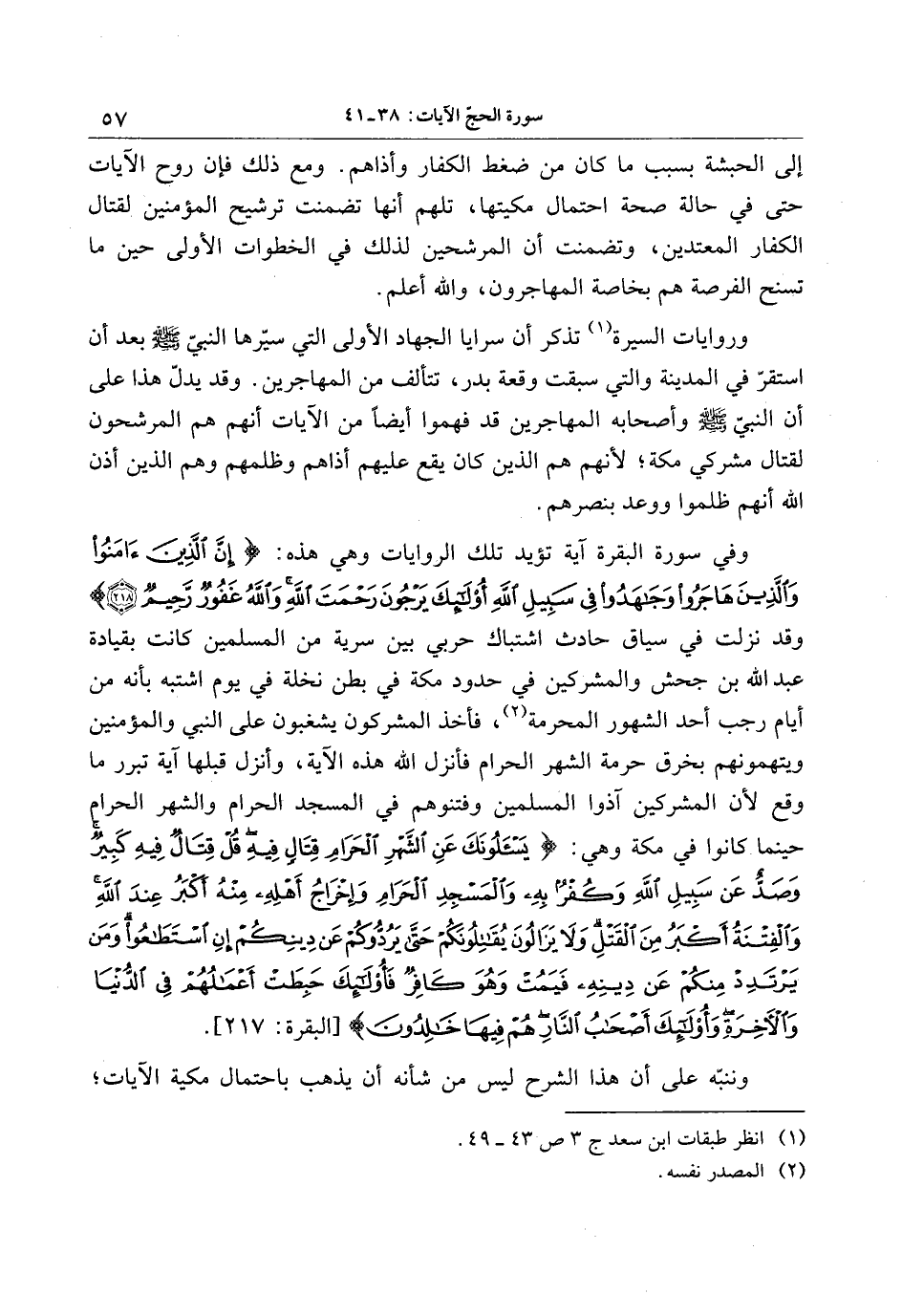 إلى الحبشة بسبب ما كان من ضغط الكفار وأذاهم. ومع ذلك فإن روح الآيات حتى في حالة صحة احتمال مكيتها، تلهم أنها تضمنت ترشيح المؤمنين لقتال الكفار المعتدين، وتضمنت أن المرشحين لذلك في الخطوات الأولى حين ما تسنح الفرصة هم بخاصة المهاجرون، والله أعلم.