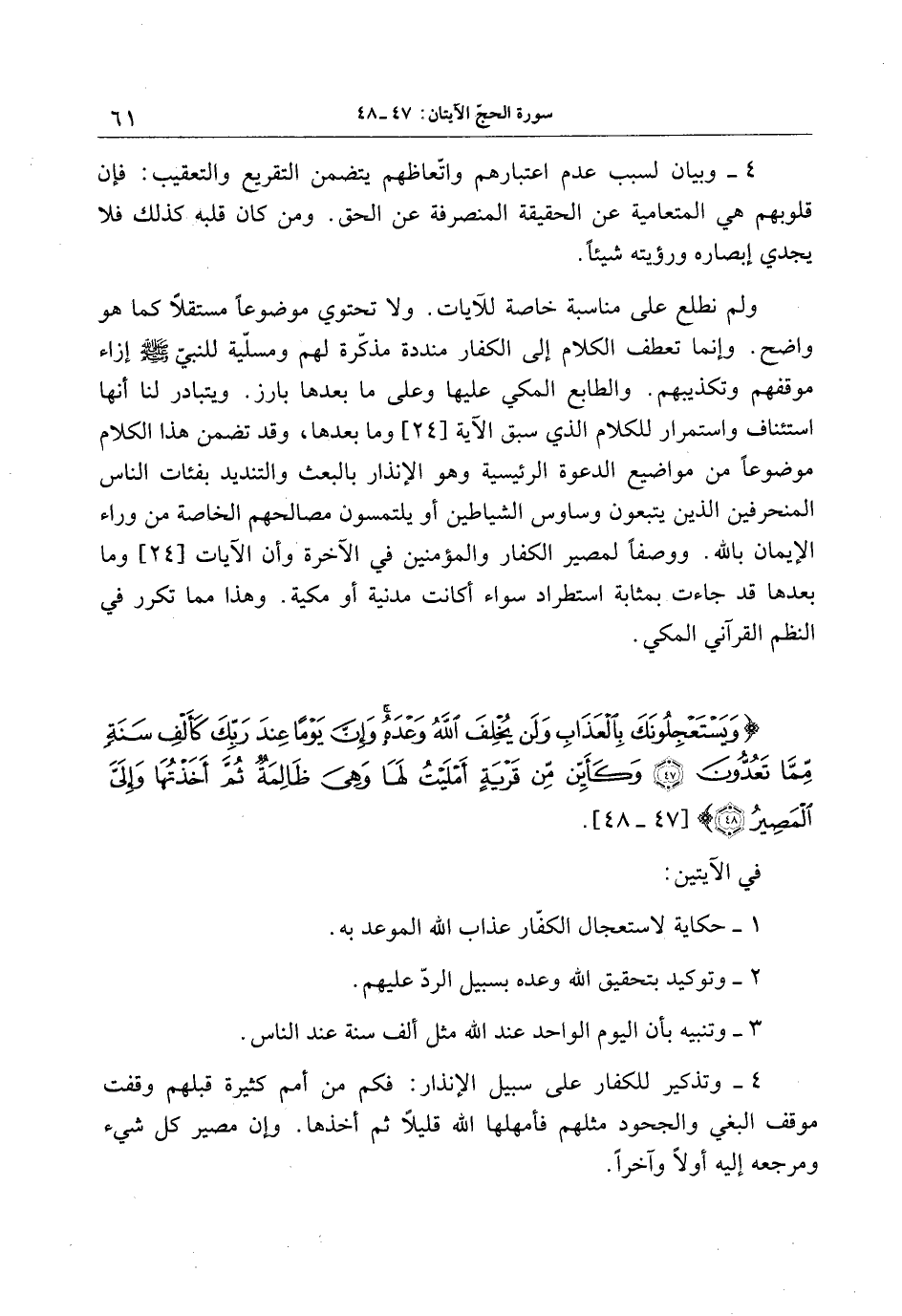 وَيَسْتَعْجِلُونَكَ بِالْعَذابِ وَلَنْ يُخْلِفَ اللَّهُ وَعْدَهُ وَإِنَّ يَوْماً عِنْدَ رَبِّكَ كَأَلْفِ سَنَةٍ مِمَّا تَعُدُّونَ (47) وَكَأَيِّنْ مِنْ قَرْيَةٍ أَمْلَيْتُ لَها وَهِيَ ظالِمَةٌ ثُمَّ أَخَذْتُها وَإِلَيَّ الْمَصِيرُ (48)