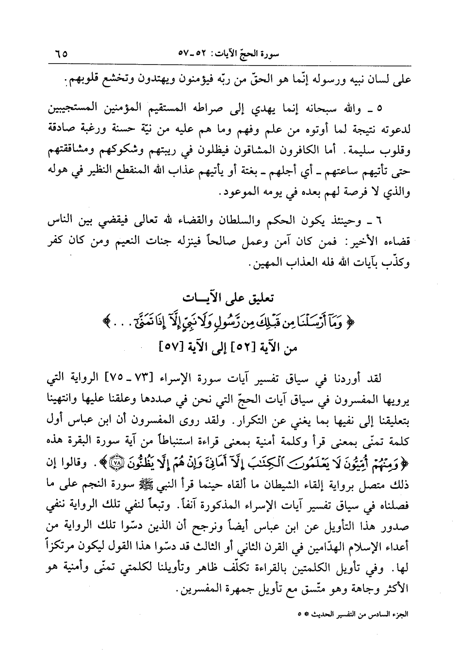 تعليق على الآيات وَما أَرْسَلْنا مِنْ قَبْلِكَ مِنْ رَسُولٍ وَلا نَبِيٍّ إِلَّا إِذا تَمَنَّى ... من الآية [52] إلى الآية [57]