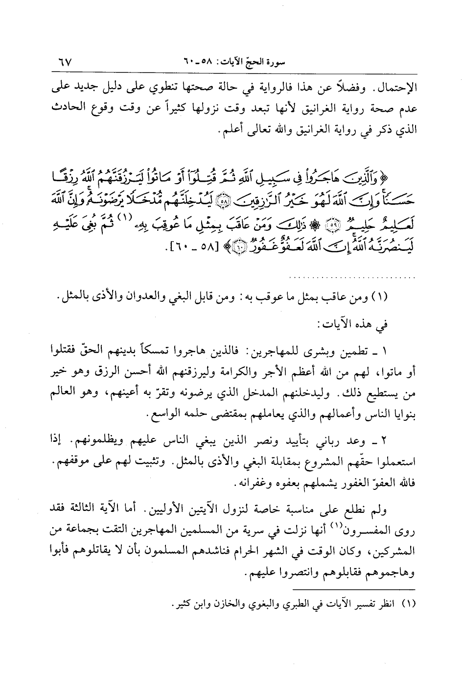 وَالَّذِينَ هاجَرُوا فِي سَبِيلِ اللَّهِ ثُمَّ قُتِلُوا أَوْ ماتُوا لَيَرْزُقَنَّهُمُ اللَّهُ رِزْقاً حَسَناً وَإِنَّ اللَّهَ لَهُوَ خَيْرُ الرَّازِقِينَ (58) لَيُدْخِلَنَّهُمْ مُدْخَلاً يَرْضَوْنَهُ وَإِنَّ اللَّهَ لَعَلِيمٌ حَلِيمٌ (59) ذلِكَ وَمَنْ عاقَبَ بِمِثْلِ ما عُوقِبَ بِهِ ثُمَّ بُغِيَ عَلَيْهِ لَيَنْصُرَنَّهُ اللَّهُ إِنَّ اللَّهَ لَعَفُوٌّ غَفُورٌ (60)