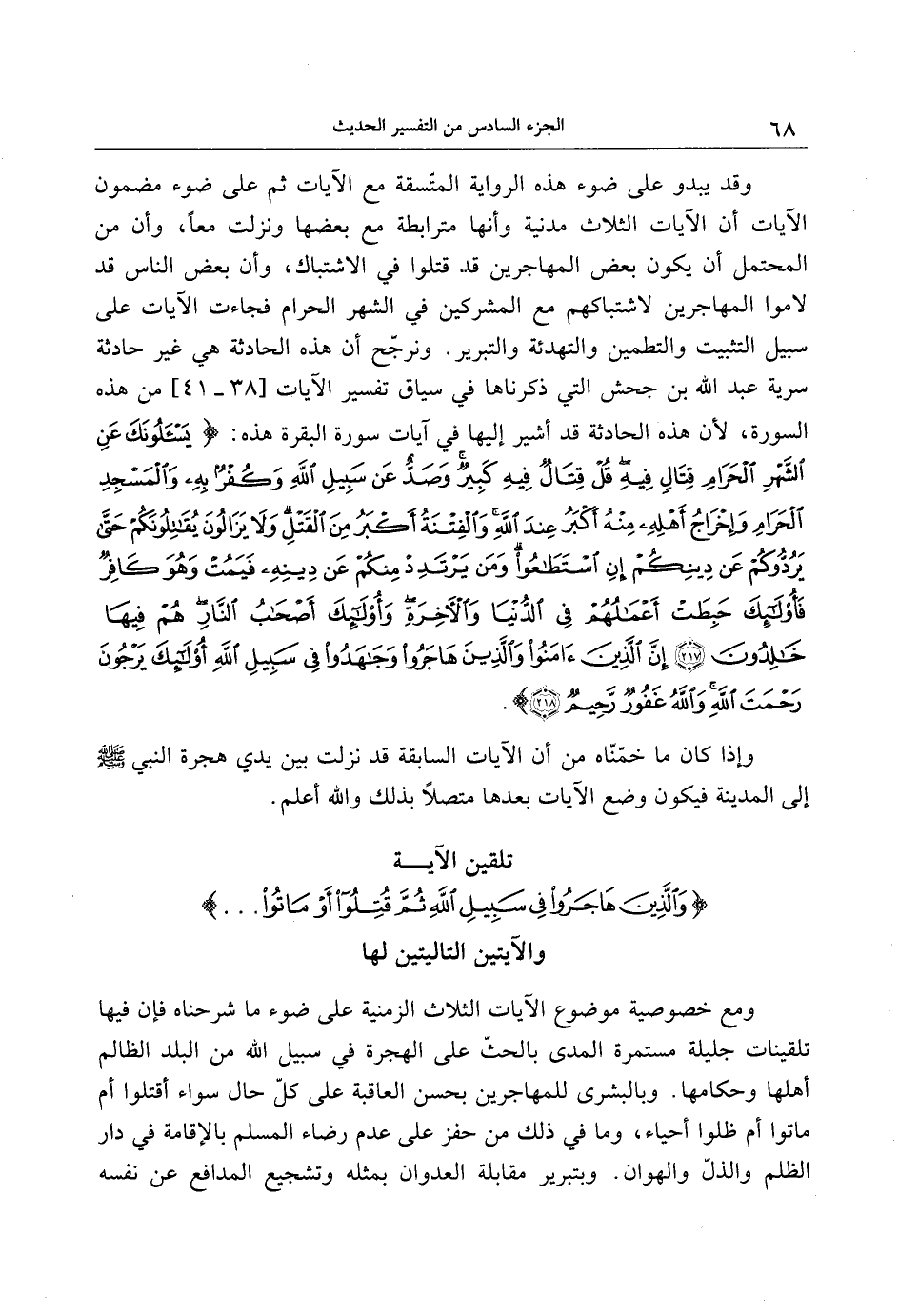 وقد يبدو على ضوء هذه الرواية المتّسقة مع الآيات ثم على ضوء مضمون الآيات أن الآيات الثلاث مدنية وأنها مترابطة مع بعضها ونزلت معا، وأن من المحتمل أن يكون بعض المهاجرين قد قتلوا في الاشتباك، وأن بعض الناس قد لاموا المهاجرين لاشتباكهم مع المشركين في الشهر الحرام فجاءت الآيات على سبيل التثبيت والتطمين والتهدئة والتبرير. ونرجّح أن هذه الحادثة هي غير حادثة سرية عبد الله بن جحش التي ذكرناها في سياق تفسير الآيات [38- 41] من هذه السورة، لأن هذه الحادثة قد أشير إليها في آيات سورة البقرة هذه: يَسْئَلُونَكَ عَنِ الشَّهْرِ الْحَرامِ قِتالٍ فِيهِ قُلْ قِتالٌ فِيهِ كَبِيرٌ وَصَدٌّ عَنْ سَبِيلِ اللَّهِ وَكُفْرٌ بِهِ وَالْمَسْجِدِ الْحَرامِ وَإِخْراجُ أَهْلِهِ مِنْهُ أَكْبَرُ عِنْدَ اللَّهِ وَالْفِتْنَةُ أَكْبَرُ مِنَ الْقَتْلِ وَلا يَزالُونَ يُقاتِلُونَكُمْ حَتَّى يَرُدُّوكُمْ عَنْ دِينِكُمْ إِنِ اسْتَطاعُوا وَمَنْ يَرْتَدِدْ مِنْكُمْ عَنْ دِينِهِ فَيَمُتْ وَهُوَ كافِرٌ فَأُولئِكَ حَبِطَتْ أَعْمالُهُمْ فِي الدُّنْيا وَالْآخِرَةِ وَأُولئِكَ أَصْحابُ النَّارِ هُمْ فِيها خالِدُونَ (217) إِنَّ الَّذِينَ آمَنُوا وَالَّذِينَ هاجَرُوا وَجاهَدُوا فِي سَبِيلِ اللَّهِ أُولئِكَ يَرْجُونَ رَحْمَتَ اللَّهِ وَاللَّهُ غَفُورٌ رَحِيمٌ (218) .