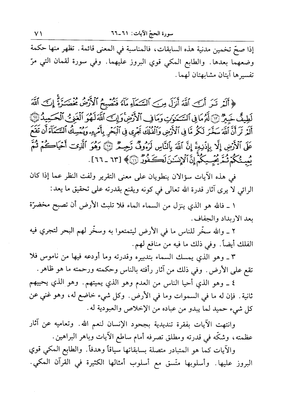 أَلَمْ تَرَ أَنَّ اللَّهَ أَنْزَلَ مِنَ السَّماءِ ماءً فَتُصْبِحُ الْأَرْضُ مُخْضَرَّةً إِنَّ اللَّهَ لَطِيفٌ خَبِيرٌ (63) لَهُ ما فِي السَّماواتِ وَما فِي الْأَرْضِ وَإِنَّ اللَّهَ لَهُوَ الْغَنِيُّ الْحَمِيدُ (64) أَلَمْ تَرَ أَنَّ اللَّهَ سَخَّرَ لَكُمْ ما فِي الْأَرْضِ وَالْفُلْكَ تَجْرِي فِي الْبَحْرِ بِأَمْرِهِ وَيُمْسِكُ السَّماءَ أَنْ تَقَعَ عَلَى الْأَرْضِ إِلاَّ بِإِذْنِهِ إِنَّ اللَّهَ بِالنَّاسِ لَرَؤُفٌ رَحِيمٌ (65) وَهُوَ الَّذِي أَحْياكُمْ ثُمَّ يُمِيتُكُمْ ثُمَّ يُحْيِيكُمْ إِنَّ الْإِنْسانَ لَكَفُورٌ (66)