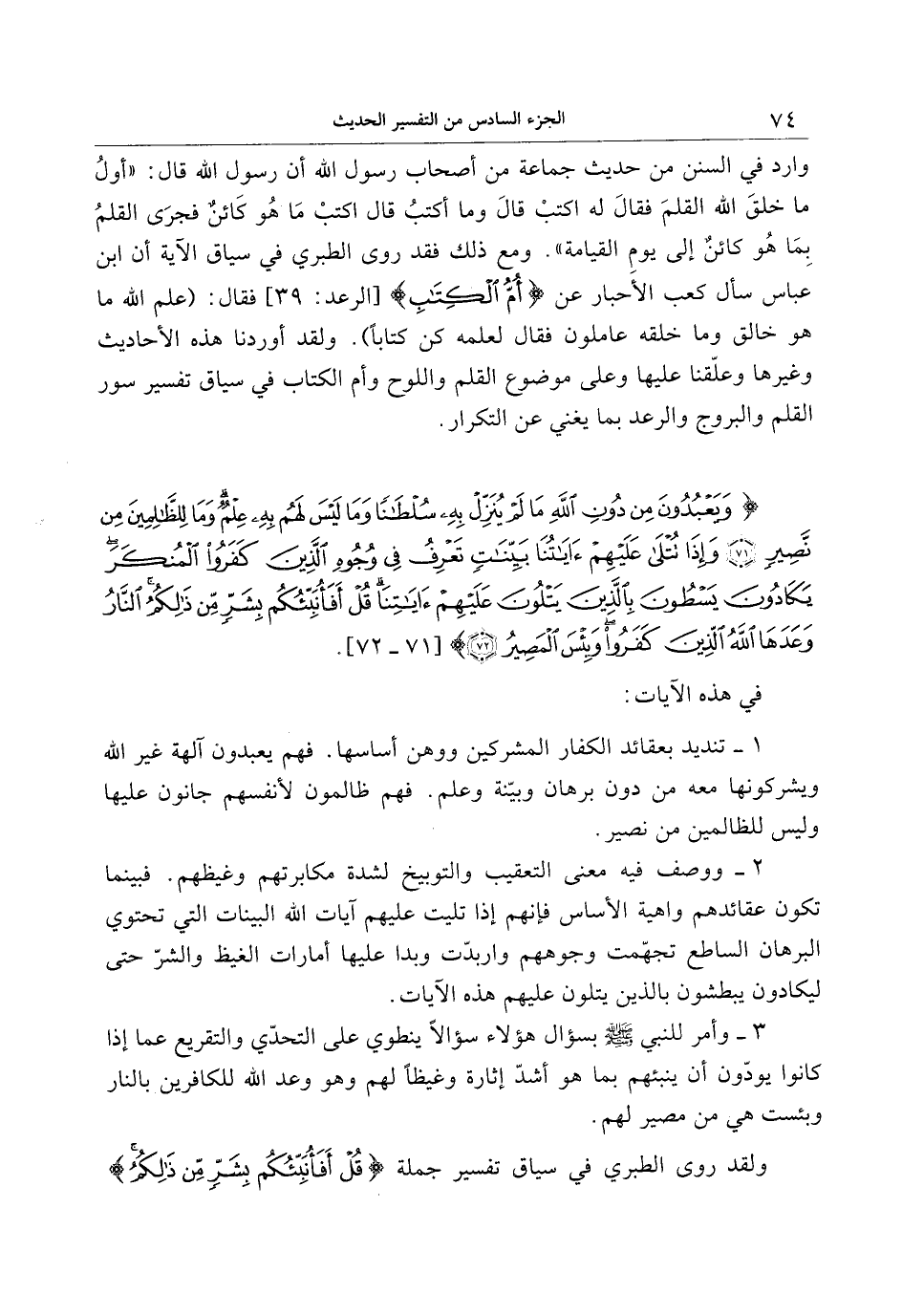 وارد في السنن من حديث جماعة من أصحاب رسول الله أن رسول الله قال: «أول ما خلق الله القلم فقال له اكتب قال وما أكتب قال اكتب ما هو كائن فجرى القلم بما هو كائن إلى يوم القيامة» . ومع ذلك فقد روى الطبري في سياق الآية أن ابن عباس سأل كعب الأحبار عن أُمُّ الْكِتابِ [الرعد: 39] فقال: (علم الله ما هو خالق وما خلقه عاملون فقال لعلمه كن كتابا) . ولقد أوردنا هذه الأحاديث وغيرها وعلّقنا عليها وعلى موضوع القلم واللوح وأم الكتاب في سياق تفسير سور القلم والبروج والرعد بما يغني عن التكرار.