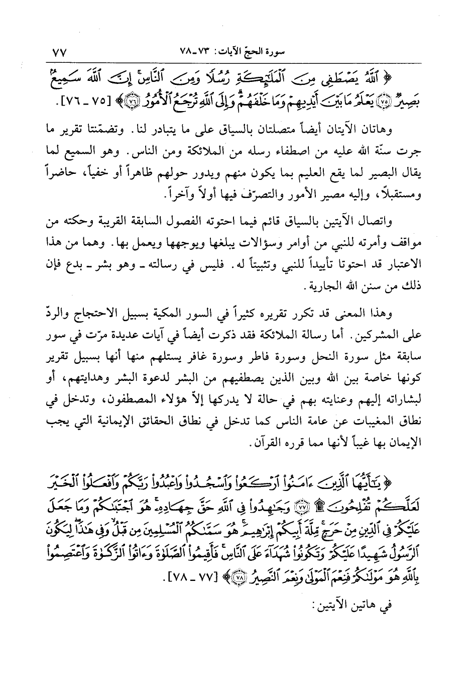 وهذا المعنى قد تكرر تقريره كثيرا في السور المكية بسبيل الاحتجاج والردّ على المشركين. أما رسالة الملائكة فقد ذكرت أيضا في آيات عديدة مرّت في سور سابقة مثل سورة النحل وسورة فاطر وسورة غافر يستلهم منها أنها بسبيل تقرير كونها خاصة بين الله وبين الذين يصطفيهم من البشر لدعوة البشر وهدايتهم، أو لبشاراته إليهم وعنايته بهم في حالة لا يدركها إلّا هؤلاء المصطفون، وتدخل في نطاق المغيبات عن عامة الناس كما تدخل في نطاق الحقائق الإيمانية التي يجب الإيمان بها غيبا لأنها مما قرره القرآن.