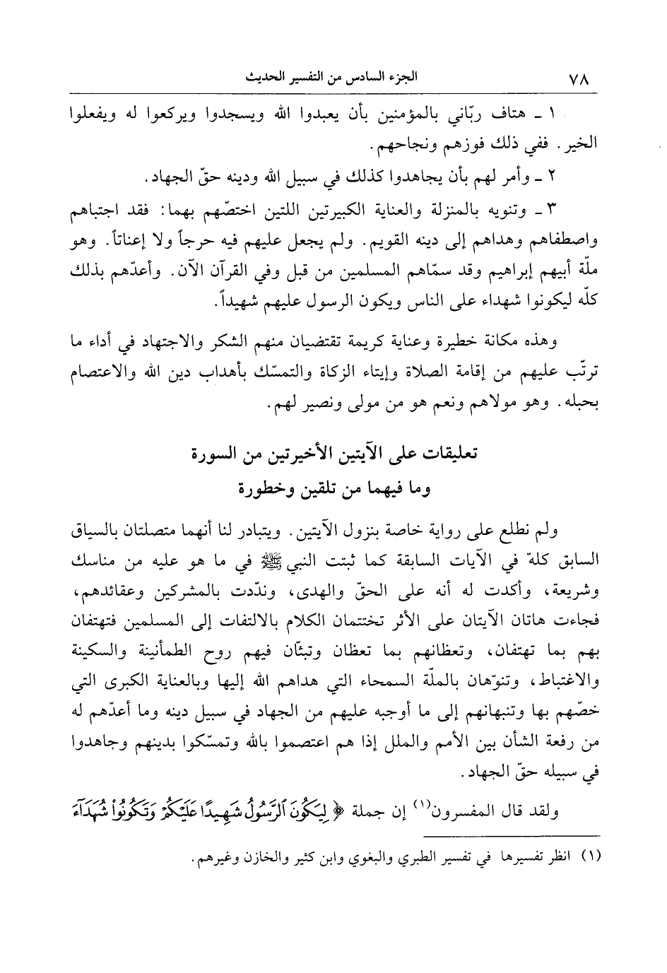 3- وتنويه بالمنزلة والعناية الكبيرتين اللتين اختصّهم بهما: فقد اجتباهم واصطفاهم وهداهم إلى دينه القويم. ولم يجعل عليهم فيه حرجا ولا إعناتا. وهو ملّة أبيهم إبراهيم وقد سمّاهم المسلمين من قبل وفي القرآن الآن. وأعدّهم بذلك كلّه ليكونوا شهداء على الناس ويكون الرسول عليهم شهيدا.