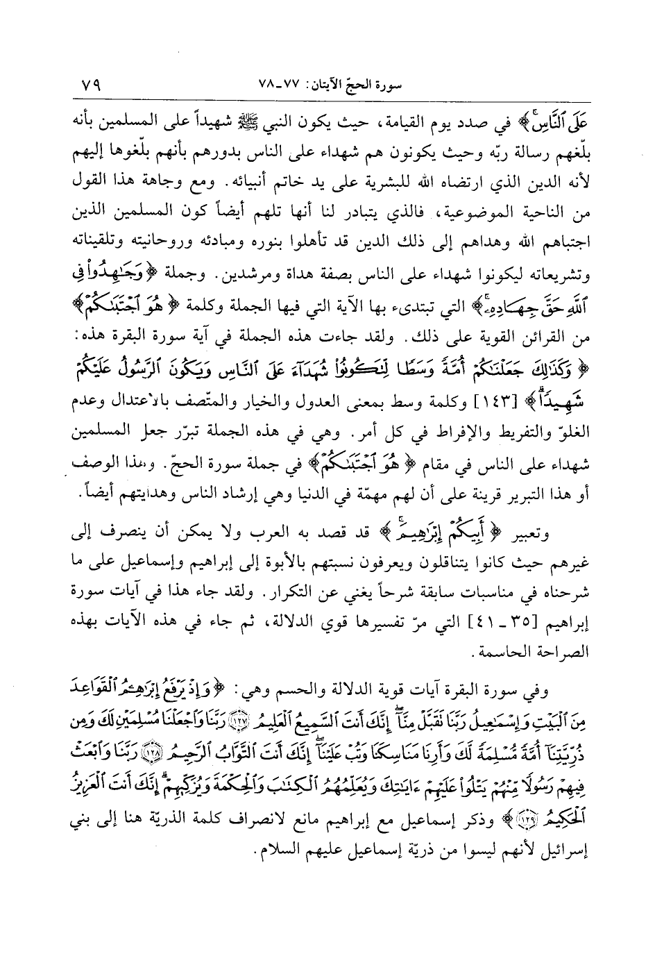 عَلَى النَّاسِ في صدد يوم القيامة، حيث يكون النبي صلّى الله عليه وسلّم شهيدا على المسلمين بأنه بلّغهم رسالة ربّه وحيث يكونون هم شهداء على الناس بدورهم بأنهم بلّغوها إليهم لأنه الدين الذي ارتضاه الله للبشرية على يد خاتم أنبيائه. ومع وجاهة هذا القول من الناحية الموضوعية، فالذي يتبادر لنا أنها تلهم أيضا كون المسلمين الذين اجتباهم الله وهداهم إلى ذلك الدين قد تأهلوا بنوره ومبادئه وروحانيته وتلقيناته وتشريعاته ليكونوا شهداء على الناس بصفة هداة ومرشدين. وجملة وَجاهِدُوا فِي اللَّهِ حَقَّ جِهادِهِ التي تبتدئ بها الآية التي فيها الجملة وكلمة هُوَ اجْتَباكُمْ من القرائن القوية على ذلك. ولقد جاءت هذه الجملة في آية سورة البقرة هذه: