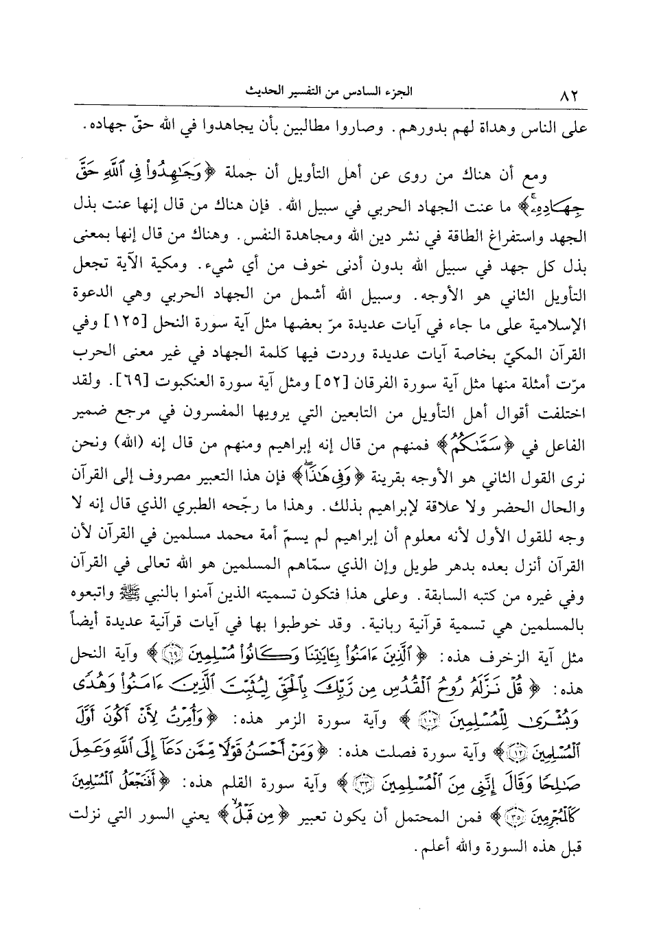 ومع أن هناك من روى عن أهل التأويل أن جملة وَجاهِدُوا فِي اللَّهِ حَقَّ جِهادِهِ ما عنت الجهاد الحربي في سبيل الله. فإن هناك من قال إنها عنت بذل الجهد واستفراغ الطاقة في نشر دين الله ومجاهدة النفس. وهناك من قال إنها بمعنى بذل كل جهد في سبيل الله بدون أدنى خوف من أي شيء. ومكية الآية تجعل التأويل الثاني هو الأوجه. وسبيل الله أشمل من الجهاد الحربي وهي الدعوة الإسلامية على ما جاء في آيات عديدة مرّ بعضها مثل آية سورة النحل [125] وفي القرآن المكيّ بخاصة آيات عديدة وردت فيها كلمة الجهاد في غير معنى الحرب مرّت أمثلة منها مثل آية سورة الفرقان [52] ومثل آية سورة العنكبوت [69] . ولقد اختلفت أقوال أهل التأويل من التابعين التي يرويها المفسرون في مرجع ضمير الفاعل في سَمَّاكُمُ فمنهم من قال إنه إبراهيم ومنهم من قال إنه (الله) ونحن نرى القول الثاني هو الأوجه بقرينة وَفِي هذا فإن هذا التعبير مصروف إلى القرآن والحال الحضر ولا علاقة لإبراهيم بذلك. وهذا ما رجّحه الطبري الذي قال إنه لا وجه للقول الأول لأنه معلوم أن إبراهيم لم يسمّ أمة محمد مسلمين في القرآن لأن القرآن أنزل بعده بدهر طويل وإن الذي سمّاهم المسلمين هو الله تعالى في القرآن وفي غيره من كتبه السابقة. وعلى هذا فتكون تسميته الذين آمنوا بالنبي صلّى الله عليه وسلّم واتبعوه بالمسلمين هي تسمية قرآنية ربانية. وقد خوطبوا بها في آيات قرآنية عديدة أيضا مثل آية الزخرف هذه: الَّذِينَ آمَنُوا بِآياتِنا وَكانُوا مُسْلِمِينَ (69) وآية النحل هذه: قُلْ نَزَّلَهُ رُوحُ الْقُدُسِ مِنْ رَبِّكَ بِالْحَقِّ لِيُثَبِّتَ الَّذِينَ آمَنُوا وَهُدىً وَبُشْرى لِلْمُسْلِمِينَ (102) وآية سورة الزمر هذه: وَأُمِرْتُ لِأَنْ أَكُونَ أَوَّلَ الْمُسْلِمِينَ (12) وآية سورة فصلت هذه: وَمَنْ أَحْسَنُ قَوْلًا مِمَّنْ دَعا إِلَى اللَّهِ وَعَمِلَ صالِحاً وَقالَ إِنَّنِي مِنَ الْمُسْلِمِينَ (33) وآية سورة القلم هذه: أَفَنَجْعَلُ الْمُسْلِمِينَ كَالْمُجْرِمِينَ (35) فمن المحتمل أن يكون تعبير مِنْ قَبْلُ يعني السور التي نزلت قبل هذه السورة والله أعلم.