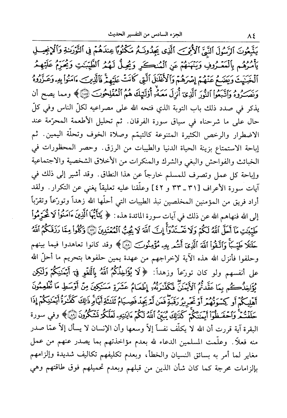 ومما يصح أن يذكر في صدد ذلك باب التوبة الذي فتحه الله على مصراعيه لكلّ الناس وفي كلّ حال على ما شرحناه في سياق سورة الفرقان. ثم تحليل الأطعمة المحرّمة عند الاضطرار والرخص الكثيرة المتنوعة كالتيمّم وصلاة الخوف وتحلّة اليمين. ثم إباحة الاستمتاع بزينة الحياة الدنيا والطيبات من الرزق. وحصر المحظورات في الخبائث والفواحش والبغي والشرك والمنكرات من الأخلاق الشخصية والاجتماعية وإباحة كل عمل وتصرف للمسلم خارجا عن هذا النطاق. وقد أشير إلى ذلك في آيات سورة الأعراف [31- 33 و 42] وعلّقنا عليه تعليقا يغني عن التكرار. ولقد أراد فريق من المؤمنين المخلصين نبذ الطيبات التي أحلّها الله زهدا وتورّعا وتقرّبا إلى الله فنهاهم الله عن ذلك في آيات سورة المائدة هذه: يا أَيُّهَا الَّذِينَ آمَنُوا لا تُحَرِّمُوا طَيِّباتِ ما أَحَلَّ اللَّهُ لَكُمْ وَلا تَعْتَدُوا إِنَّ اللَّهَ لا يُحِبُّ الْمُعْتَدِينَ (87) وَكُلُوا مِمَّا رَزَقَكُمُ اللَّهُ حَلالًا طَيِّباً وَاتَّقُوا اللَّهَ الَّذِي أَنْتُمْ بِهِ مُؤْمِنُونَ (88) وقد كانوا تعاهدوا فيما بينهم وحلفوا فأنزل الله هذه الآية لإخراجهم من عهدة يمين حلفوها بتحريم ما أحلّ الله على أنفسهم ولو كان تورّعا وزهدا: لا يُؤاخِذُكُمُ اللَّهُ بِاللَّغْوِ فِي أَيْمانِكُمْ وَلكِنْ يُؤاخِذُكُمْ بِما عَقَّدْتُمُ الْأَيْمانَ فَكَفَّارَتُهُ إِطْعامُ عَشَرَةِ مَساكِينَ مِنْ أَوْسَطِ ما تُطْعِمُونَ أَهْلِيكُمْ أَوْ كِسْوَتُهُمْ أَوْ تَحْرِيرُ رَقَبَةٍ فَمَنْ لَمْ يَجِدْ فَصِيامُ ثَلاثَةِ أَيَّامٍ ذلِكَ كَفَّارَةُ أَيْمانِكُمْ إِذا حَلَفْتُمْ وَاحْفَظُوا أَيْمانَكُمْ كَذلِكَ يُبَيِّنُ اللَّهُ لَكُمْ آياتِهِ لَعَلَّكُمْ تَشْكُرُونَ (89) وفي سورة البقرة آية قررت أن الله لا يكلّف نفسا إلّا وسعها وأن الإنسان لا يسأل إلّا عمّا صدر منه فعلا. وعلّمت المسلمين الدعاء لله بعدم مؤاخذتهم بما يصدر عنهم من عمل مغاير لما أمر به بسائق النسيان والخطأ، وبعدم تكليفهم تكاليف شديدة وإلزامهم بإلزامات محرجة كما كان شأن الذين من قبلهم وبعدم تحميلهم فوق طاقتهم وهي