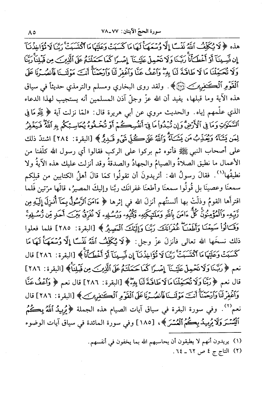 هذه لا يُكَلِّفُ اللَّهُ نَفْساً إِلَّا وُسْعَها لَها ما كَسَبَتْ وَعَلَيْها مَا اكْتَسَبَتْ رَبَّنا لا تُؤاخِذْنا إِنْ نَسِينا أَوْ أَخْطَأْنا رَبَّنا وَلا تَحْمِلْ عَلَيْنا إِصْراً كَما حَمَلْتَهُ عَلَى الَّذِينَ مِنْ قَبْلِنا رَبَّنا وَلا تُحَمِّلْنا ما لا طاقَةَ لَنا بِهِ وَاعْفُ عَنَّا وَاغْفِرْ لَنا وَارْحَمْنا أَنْتَ مَوْلانا فَانْصُرْنا عَلَى الْقَوْمِ الْكافِرِينَ (28) . ولقد روى البخاري ومسلم والترمذي حديثا في سياق هذه الآية وما قبلها، يفيد أن الله عزّ وجلّ آذن المسلمين أنه يستجيب لهذا الدعاء الذي علّمهم إياه. والحديث مروي عن أبي هريرة قال: «لمّا نزلت آية لِلَّهِ ما فِي السَّماواتِ وَما فِي الْأَرْضِ وَإِنْ تُبْدُوا ما فِي أَنْفُسِكُمْ أَوْ تُخْفُوهُ يُحاسِبْكُمْ بِهِ اللَّهُ فَيَغْفِرُ لِمَنْ يَشاءُ وَيُعَذِّبُ مَنْ يَشاءُ وَاللَّهُ عَلى كُلِّ شَيْءٍ قَدِيرٌ [البقرة: 284] اشتدّ ذلك على أصحاب النبي صلّى الله عليه وسلّم فأتوه ثم بركوا على الركب فقالوا أي رسول الله كلّفنا من الأعمال ما نطيق الصلاة والصيام