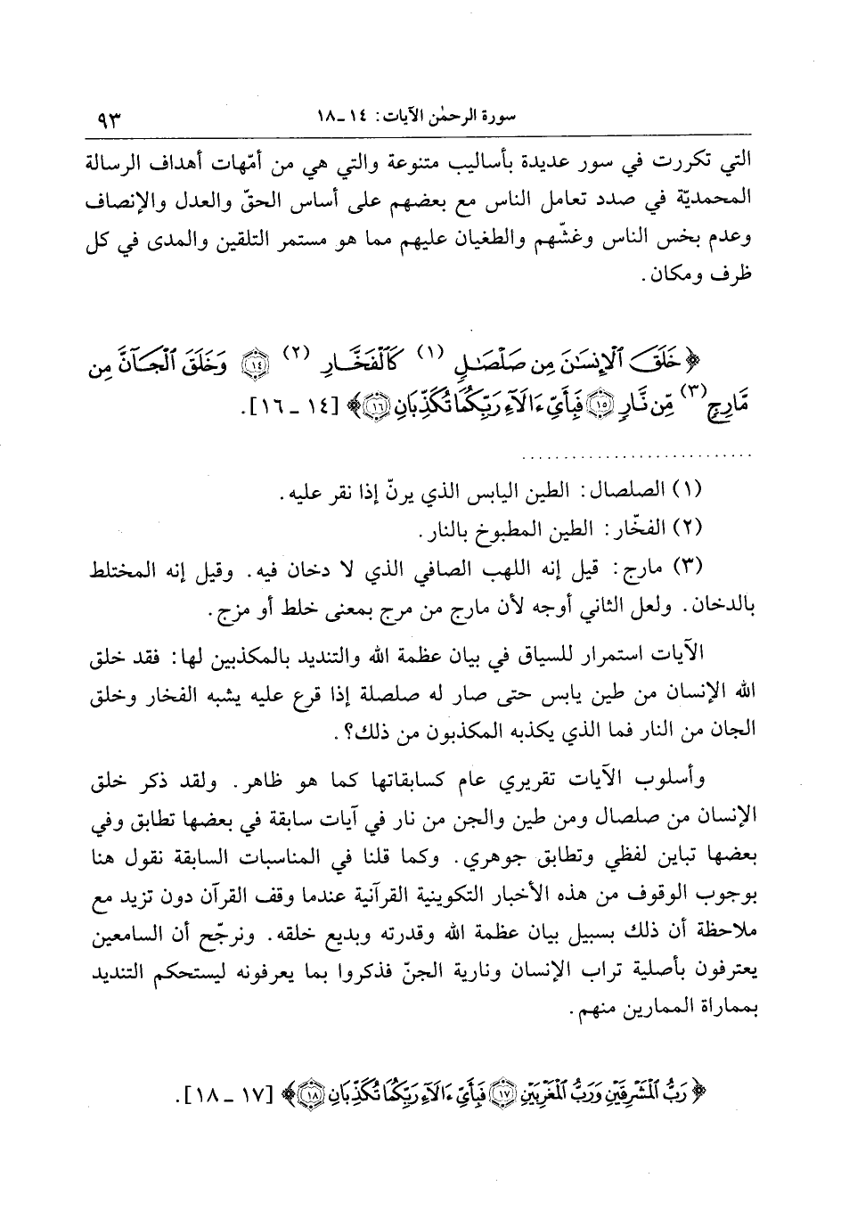 خَلَقَ الْإِنْسانَ مِنْ صَلْصالٍ كَالْفَخَّارِ (14) وَخَلَقَ الْجَانَّ مِنْ مارِجٍ مِنْ نارٍ (15) فَبِأَيِّ آلاءِ رَبِّكُما تُكَذِّبانِ (16)