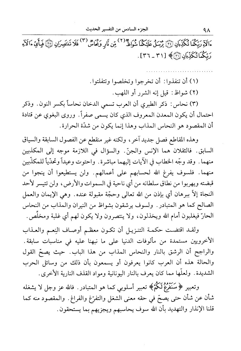 وهذه المقاطع فصل جديد آخر، ولكنه غير منقطع عن الفصول السابقة والسياق السابق. فالثقلان هما الإنس والجنّ. والسؤال في اللازمة موجه إلى المكذبين منهما. وقد وجّه الخطاب في الآيات إليهما مباشرة. واحتوت وعيدا وتحدّيا للمكذّبين منهما. فلسوف يفرغ الله لحسابهم على أعمالهم. ولن يستطيعوا أن ينجوا من قبضته ويهربوا من نطاق سلطانه من أي ناحية في السموات والأرض، ولن تتيسر لأحد النجاة إلّا ببرهان أي بإذن من الله تعالى وحجّة مقبولة عنده. وهي الإيمان والعمل الصالح كما هو المتبادر. ولسوف يرشقون بشواظ من النيران والمذاب من النحاس الحارّ فيغلبون أمام الله ويخذلون، ولا ينتصرون ولا يكون لهم أي غلبة ومخلّص.