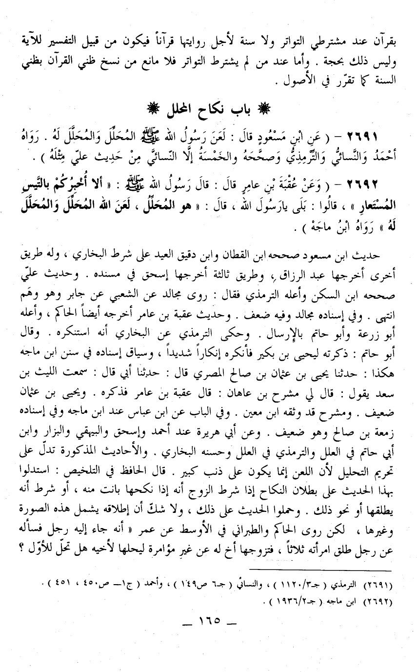 2691 - (عَنْ ابْنِ مَسْعُودٍ قَالَ: «لَعَنَ رَسُولُ اللَّهِ - صَلَّى اللَّهُ عَلَيْهِ وَسَلَّمَ - الْمُحَلِّلَ وَالْمُحَلَّلَ لَهُ» رَوَاهُ أَحْمَدُ وَالنَّسَائِيُّ وَالتِّرْمِذِيُّ وَصَحَّحَهُ وَالْخَمْسَةُ إلَّا النَّسَائِيّ مِنْ حَدِيثِ عَلِيٍّ مِثْلَهُ) .