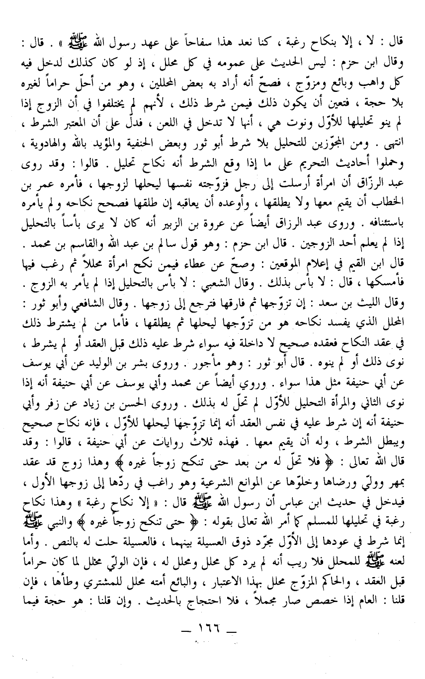قَالَ: وَقَالَ ابْنُ حَزْمٍ: لَيْسَ الْحَدِيثُ عَلَى عُمُومِهِ فِي كُلِّ مُحَلِّلٍ، إذْ لَوْ كَانَ كَذَلِكَ لَدَخَلَ فِيهِ كُلُّ وَاهِبٍ وَبَائِعٍ وَمُزَوِّجٍ، فَصَحَّ أَنَّهُ أَرَادَ بِهِ بَعْضَ الْمُحَلِّلِينَ، وَهُوَ مَنْ أَحَلَّ حَرَامًا لِغَيْرِهِ بِلَا حُجَّةٍ، فَتَعَيَّنَ أَنْ يَكُونَ ذَلِكَ فِيمَنْ شَرَطَ ذَلِكَ؛ لِأَنَّهُمْ لَمْ يَخْتَلِفُوا فِي أَنَّ الزَّوْجَ إذَا لَمْ يَنْوِ تَحْلِيلَهَا لِلْأَوَّلِ وَنَوَتْ هِيَ، أَنَّهَا لَا تَدْخُلُ فِي اللَّعْنِ، فَدَلَّ عَلَى أَنَّ الْمُعْتَبَرَ الشَّرْطُ، انْتَهَى