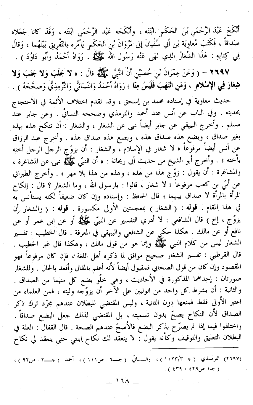 حَدِيثُ مُعَاوِيَةَ فِي إسْنَادِهِ مُحَمَّدُ بْنُ إِسْحَاقَ، وَقَدْ تَقَدَّمَ اخْتِلَافُ الْأَئِمَّةِ فِي الِاحْتِجَاجِ بِحَدِيثِهِ وَفِي الْبَابِ عَنْ أَنَسٍ عِنْدَ أَحْمَدَ وَالتِّرْمِذِيِّ وَصَحَّحَهُ النَّسَائِيّ وَعَنْ جَابِرٍ عِنْدَ مُسْلِمٍ وَأَخْرَجَ الْبَيْهَقِيُّ عَنْ جَابِرٍ أَيْضًا نُهِيَ عَنْ الشِّغَارِ، وَالشِّغَارُ: أَنْ تُنْكَحَ هَذِهِ بِهَذِهِ بِغَيْرِ صَدَاقٍ، وَبُضْعُ هَذِهِ صَدَاقُ هَذِهِ، وَبُضْعُ هَذِهِ صَدَاقُ هَذِهِ