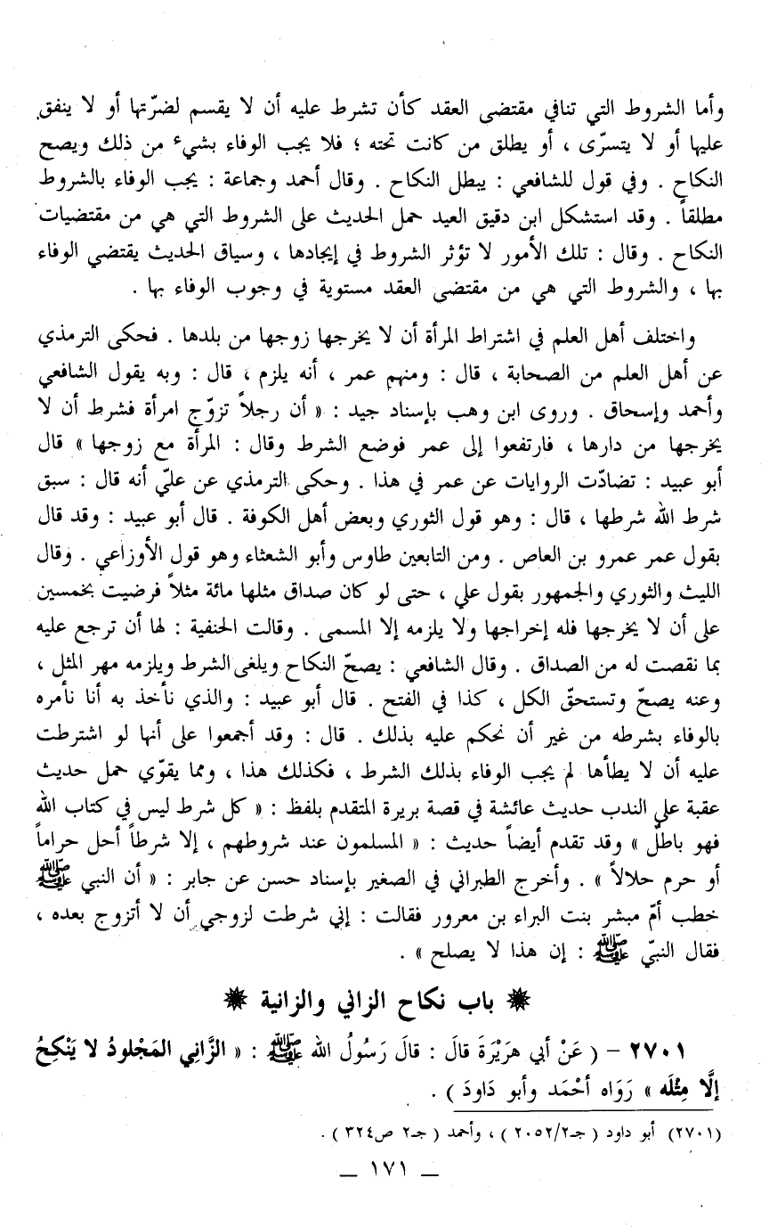 وَفِي قَوْلٍ لِلشَّافِعِيِّ بَطَلَ النِّكَاحُ وَقَالَ أَحْمَدُ وَجَمَاعَةٌ: يَجِبُ الْوَفَاءُ بِالشُّرُوطِ مُطْلَقًا وَقَدْ اسْتَشْكَلَ ابْنُ دَقِيقِ الْعِيدِ حَمْلَ الْحَدِيثِ عَلَى الشُّرُوطِ الَّتِي هِيَ مِنْ مُقْتَضَيَاتِ النِّكَاحِ وَقَالَ: تِلْكَ الْأُمُورُ لَا تُؤَثِّرُ الشُّرُوطُ فِي إيجَادِهَا، وَسِيَاقُ الْحَدِيثِ يَقْتَضِي الْوَفَاءَ بِهَا، وَالشُّرُوطُ الَّتِي هِيَ مِنْ مُقْتَضَى الْعَقْدِ مُسْتَوِيَةٌ فِي وُجُوبِ الْوَفَاءِ بِهَا وَاخْتَلَفَ أَهْلُ الْعِلْمِ فِي اشْتِرَاطِ الْمَرْأَةِ أَنْ لَا يُخْرِجُهَا زَوْجُهَا مِنْ بَلَدِهَا فَحَكَى التِّرْمِذِيُّ عَنْ أَهْلِ الْعِلْمِ مِنْ الصَّحَابَةِ، قَالَ: وَمِنْهُمْ عُمَرُ، أَنَّهُ يَلْزَمُ، قَالَ: وَبِهِ يَقُولُ الشَّافِعِيُّ وَأَحْمَدُ وَإِسْحَاقُ