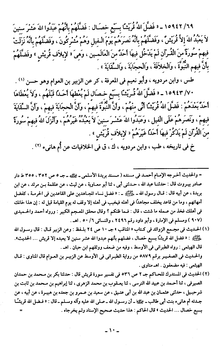 (¬1) الحديث في مجمع الزوائد في كتاب "المناقب" ج 10 ص 24 بلفظ: وعن الزبير قال: قال رسول الله - صلى الله عليه وسلم -: "فضل الله قريشًا بسبع خصال، فضلهم بأنهم عبدوا الله عشر سنين لا يعبده إلا قريش ... الحديث".