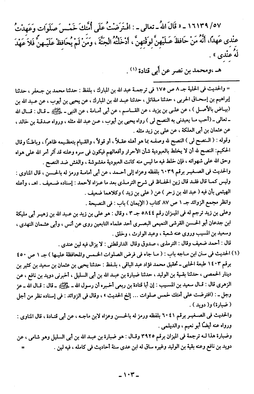 (¬1) الحديث في سنن ابن ماجه باب: (ما جاء في فرض الصلوات الخمس والمحافظة عليها) جـ 1 هـ 450 برقم 1403 طبعة الحلبى- تحقيق محمد فؤاد عبد الباقي، بلفظ: حدثنا يحيى بن عثمان بن سعيد بن كثير بن دينار الحمصى، حدثنا بقية بن الوليد، حدثنا ضبارة بن عبد الله بن أبي السليل، أخبرني دويد بن نافع، عن الزهري قال: قال سعيد بن المسيب: إن أبا قنادة بن ربعي أخبره أن رسول الله - صلى الله عليه وسلم - قال: قال الله -عز وجل-: (افترضت على أمتك خمس صلوات ... إلخ الحديث"، وقال في الزوائد: في إسناده نظر من أجل (ضبارة) و (دويد).