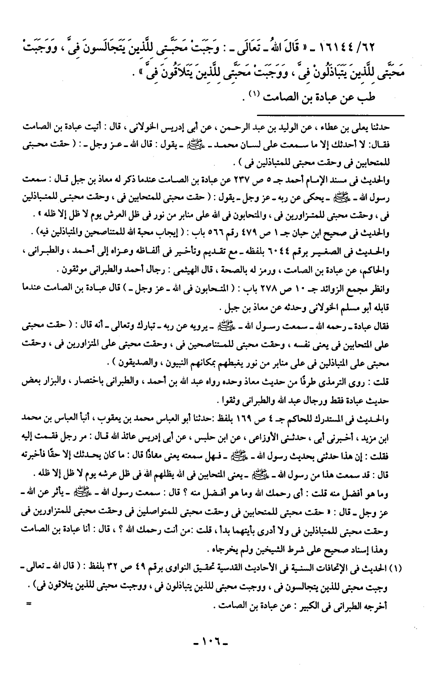 وانظر مجمع الزوائد جـ 10 ص 278 باب: (المتحابون في الله -عزَّ وجلَّ-) قال عبادة بن الصامت عندما قابله أبو مسلم الخولانى وحدثه عن معاذ بن جبل.