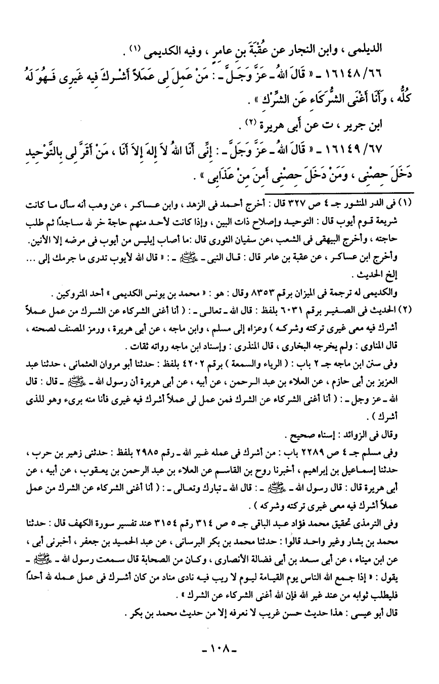 وفي سنن ابن ماجه جـ 2 باب: (الرياء والسمعة) برقم 4204 بلفظ: حدثنا أبو مروان العثمانى، حدثنا عبد العزيز بن أبي حازم، عن العلاء بن عبد الرحمن، عن أبيه، عن أبي هريرة أن رسول الله - صلى الله عليه وسلم - قال: قال الله -عزَّ وجلَّ-: (أنا أغنى الشركاء عن الشرك فمن عمل لي عملًا أشرك فيه غيرى فأنا منه برئ وهو للذي أشرك).
