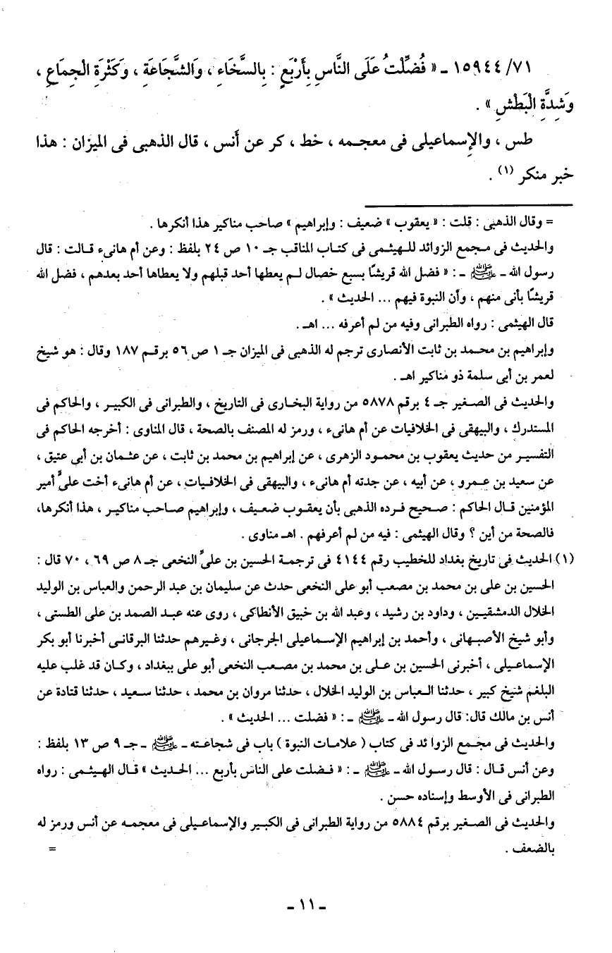71/ 15944 - "فُضِّلْتُ عَلَى النَّاسِ بِأَرْبَعٍ: بِالسَّخَاء، وَالشَّجَاعَةِ، وَكَثْرَةِ الجِمَاعِ، وَشِدَّةِ الْبَطشِ".